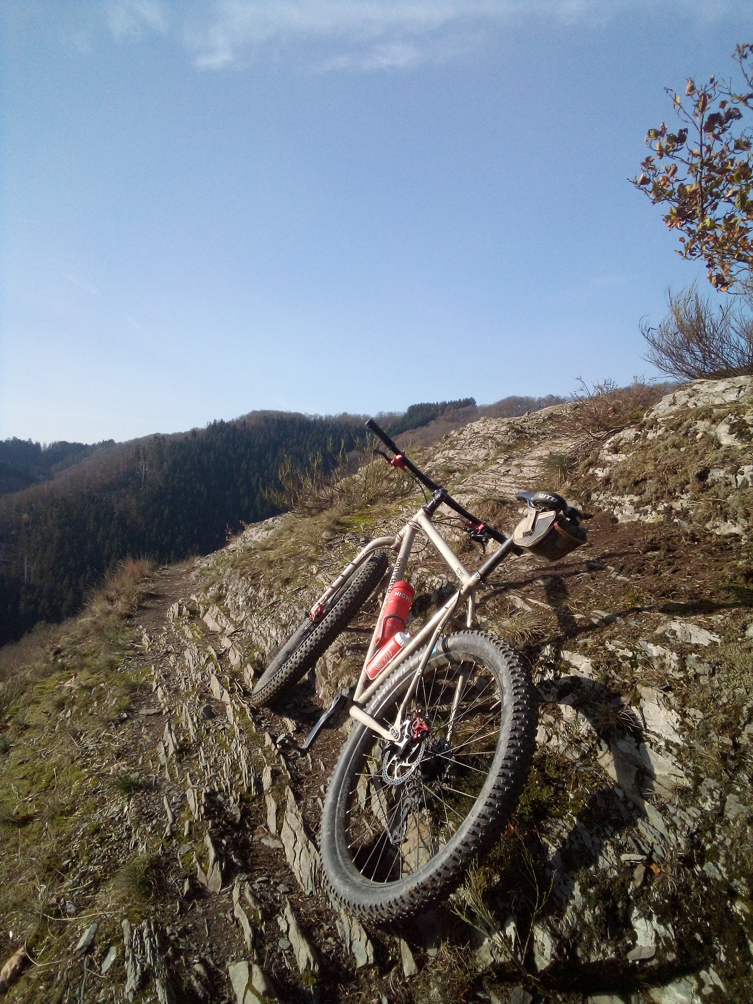 Ik haal het in mijn hoofd om een deel van de Lee Trail te fietsen. Eerst wat opwarmen met een goed uitgepeilde MTB route in de buurt van de camping. Een klein uur en redelijk wat hoogtemeters later beslis ik dat het tijd is voor het moeilijke werk. De Moberlee Kam (een kammetje natuurlijk). Een supertechnisch stuk. Een paar locals scheuren het pad naar beneden. Ik heb daar niet de skills voor en kies voor een combinatie van stappen en fietsen. Niet om me voor te schamen denk ik gans de tijd… Daarna gaat het via een variatie van bospadjes en weidewegels op en neer. Een paar supersteile klimmen en afdalingen later kom ik op een mini wandelpad. Deze gaat naar Dirbach Plage, waar een leuk restaurant hotel en een ‘strand‘ (granieten stuk steen) wachten in warmere maanden.