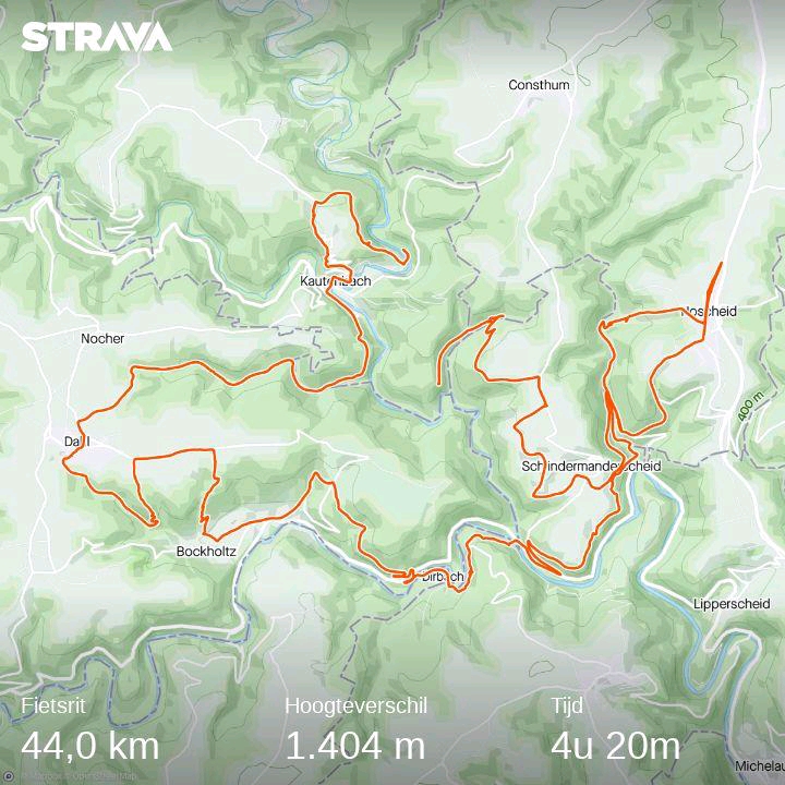 Vandaar begint het freewheelen en het breien aan een onbekend parcours. Via Bockholtz richting Dahl. De klim is pittig en er wordt weer gestapt, daarna volgt een leuke snelle afdaling met haarspeldbochtjes en brede lekker drassige bospaden, richting Kautenbach. Daar beslis ik om nog een stuk van de Lee Trail te rijden die we niet gestapt hadden in juni wegens iets te veel geaperitiefd. Het parcours geeft me gelijk. Goed dat we dit niet gestapt hebben na de lekkere biertjes. Het is nog een zwaar stuk naar boven, hier geen voetjes aan de grond. De afdaling richting camping is heel leuk en heel steil. Deze lukt me wel zonder stops. Eindelijk weer één met de fiets! Op de camping wacht een late lunch en een lekkere Duvel.