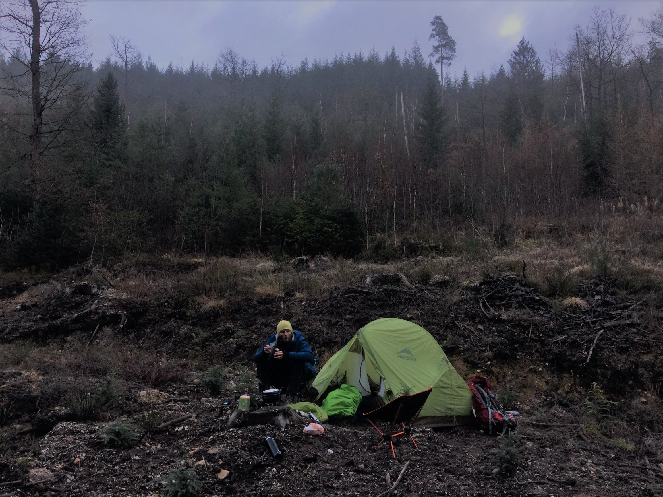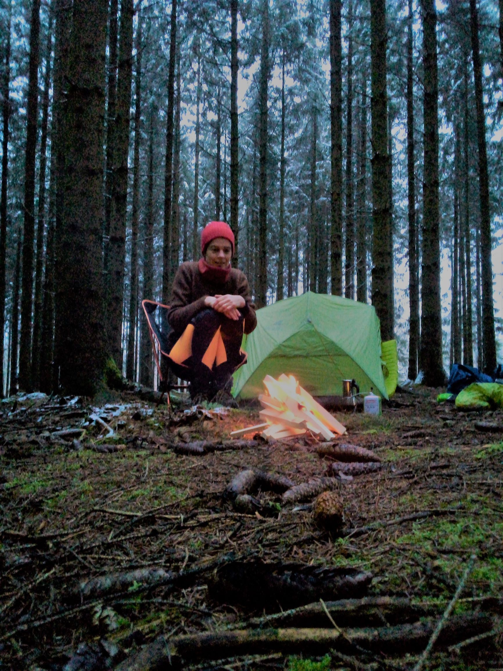 Kerstvakantie. Na een week met de kindjes in een stacaravan in Saint-Hubert waar de dagen bestaan uit de pellet-kachel terug aankrijgen, de condens van de vloer dweilen, in de sneeuw/modder sloffen, glijden en rollen, lezen en breien hebben we een lichte knaldrang om er nog eens met de tent en de rugzak op uit te trekken. Het wordt de GR15, een langeafstandspand van 220km dat loopt van Monschau naar Aarlen langs de Hoge Ardennen. We lichten er een klein stuk uit, de etappe van Eupen naar Aywaille, een 56 km, de dagen zijn kort, het hoeven geen monster etappes te zijn. We springen op 1 januari om 9u (wie had dat ooit gedacht) op de trein naar Eupen voor 3 dagen wandelen. Anders dan anders is het winter! We duwen allebei een donsslaapzak met extra liner en thermisch ondergoed in de rugzak, samen met het luxe-artikel van het jaar, de vouwbare ultralichte stoel. Geen pauzes op een vochtige boomstronk in 2021!