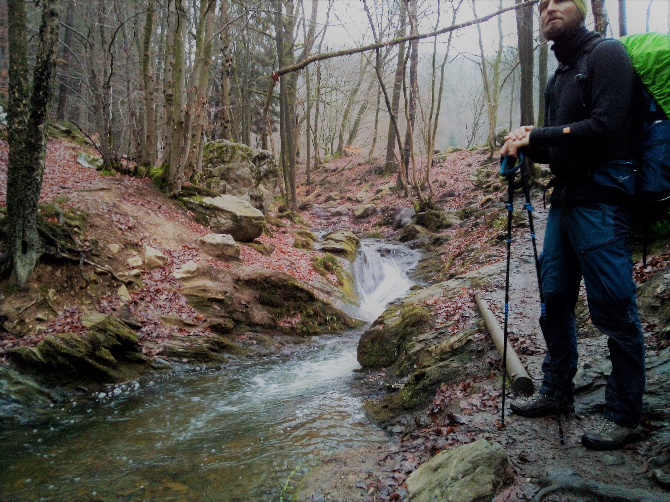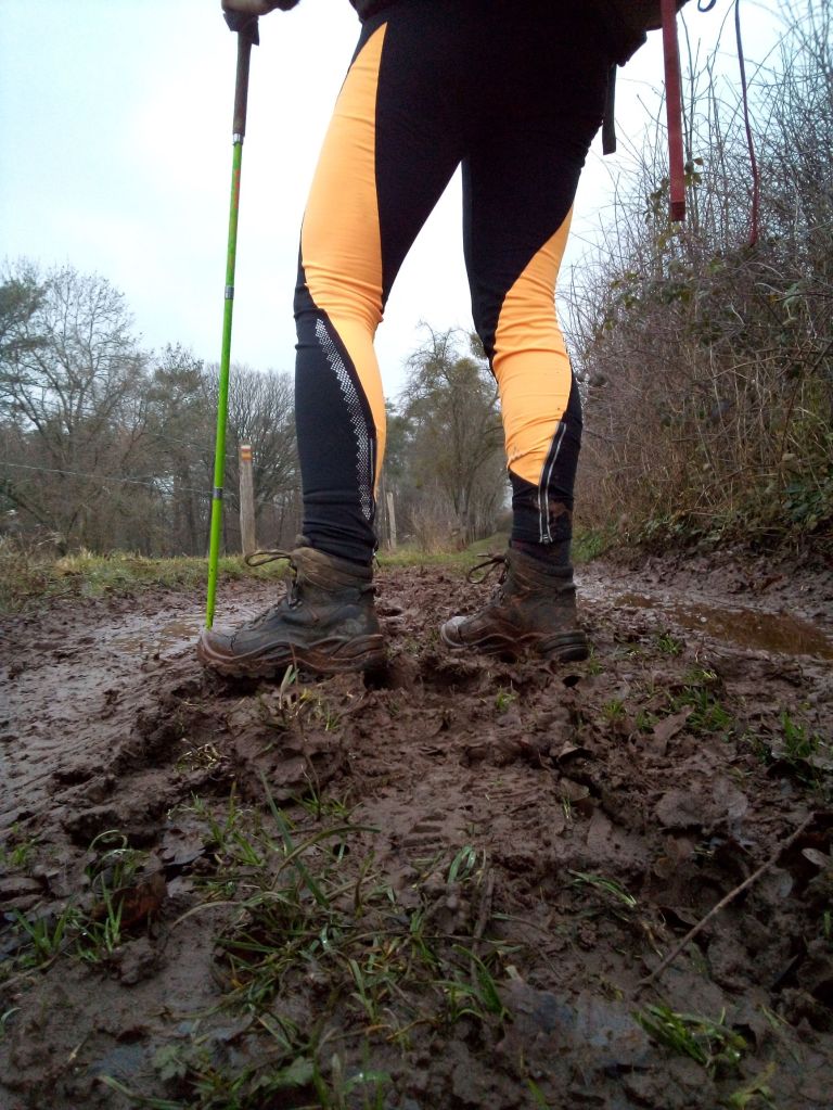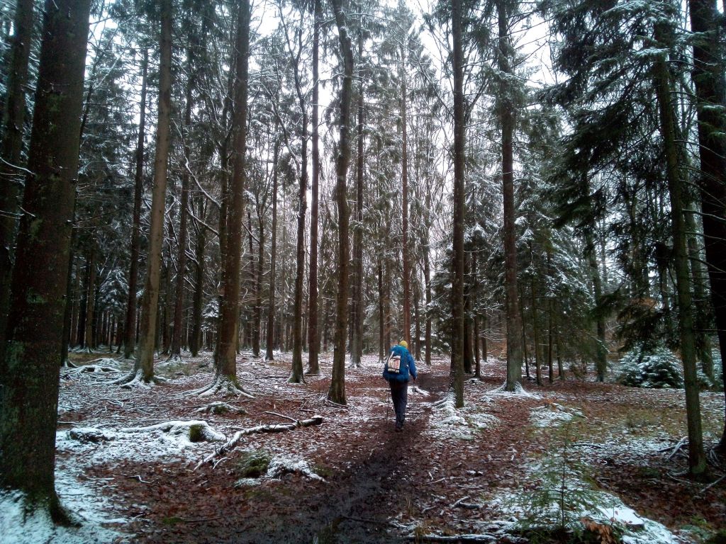 Het is een gevarieerd pad, we wandelen door dichte bossen, eindeloze glibberige veldpaden, op en neer, in de stilte met een laagje sneeuw. De ganse middag zien we ideale plekjes om de tent op te zetten, plat, open, droog, kabbelend beekje in de buurt, maar vanaf het moment dat we een tentplek zoeken is het gedaan met mooie plekjes. Vanaf nu enkel dorpen, verzopen weides, scheve bossen en vooral veel water.