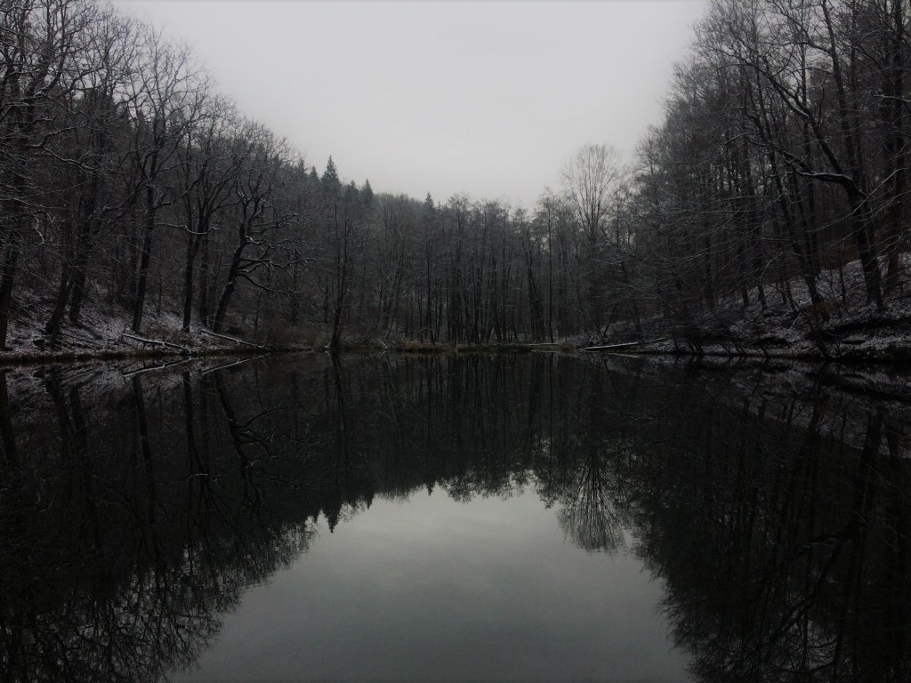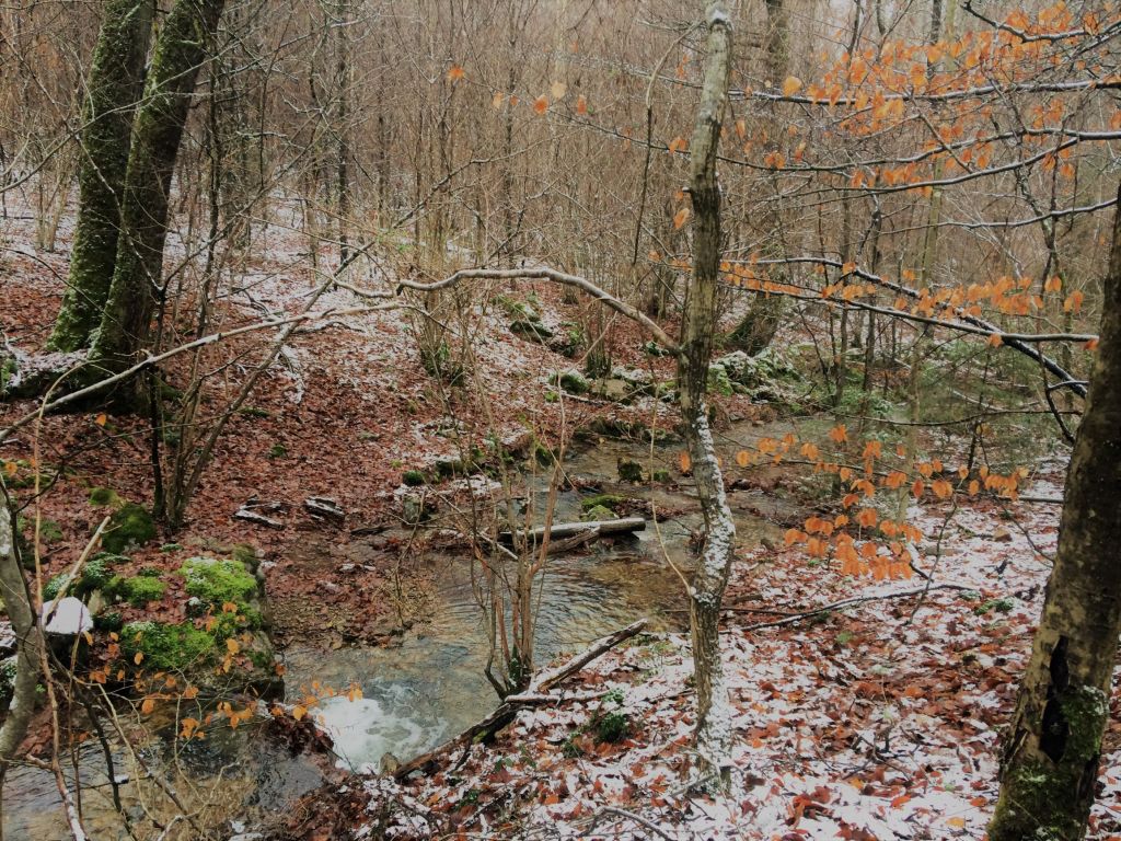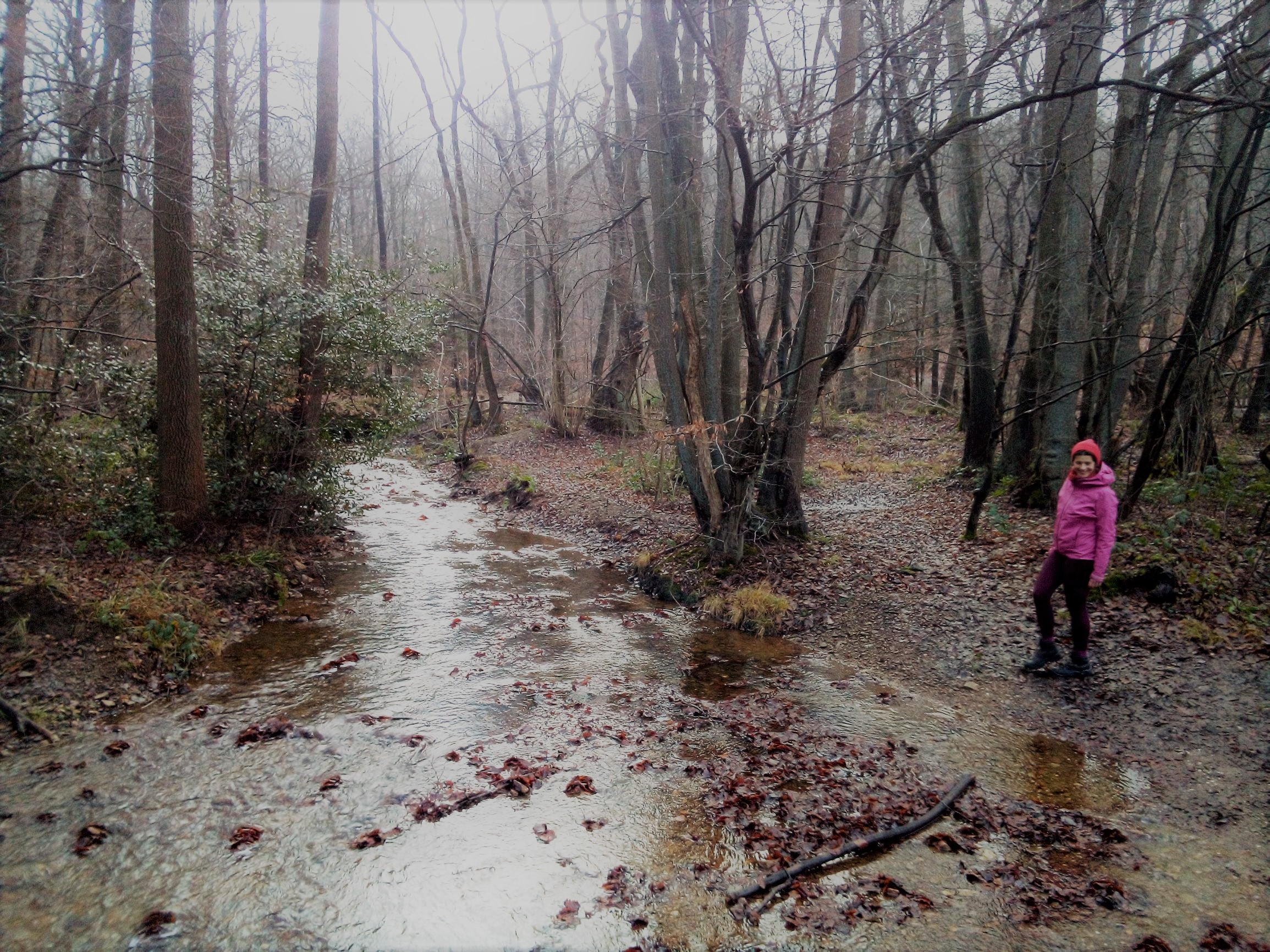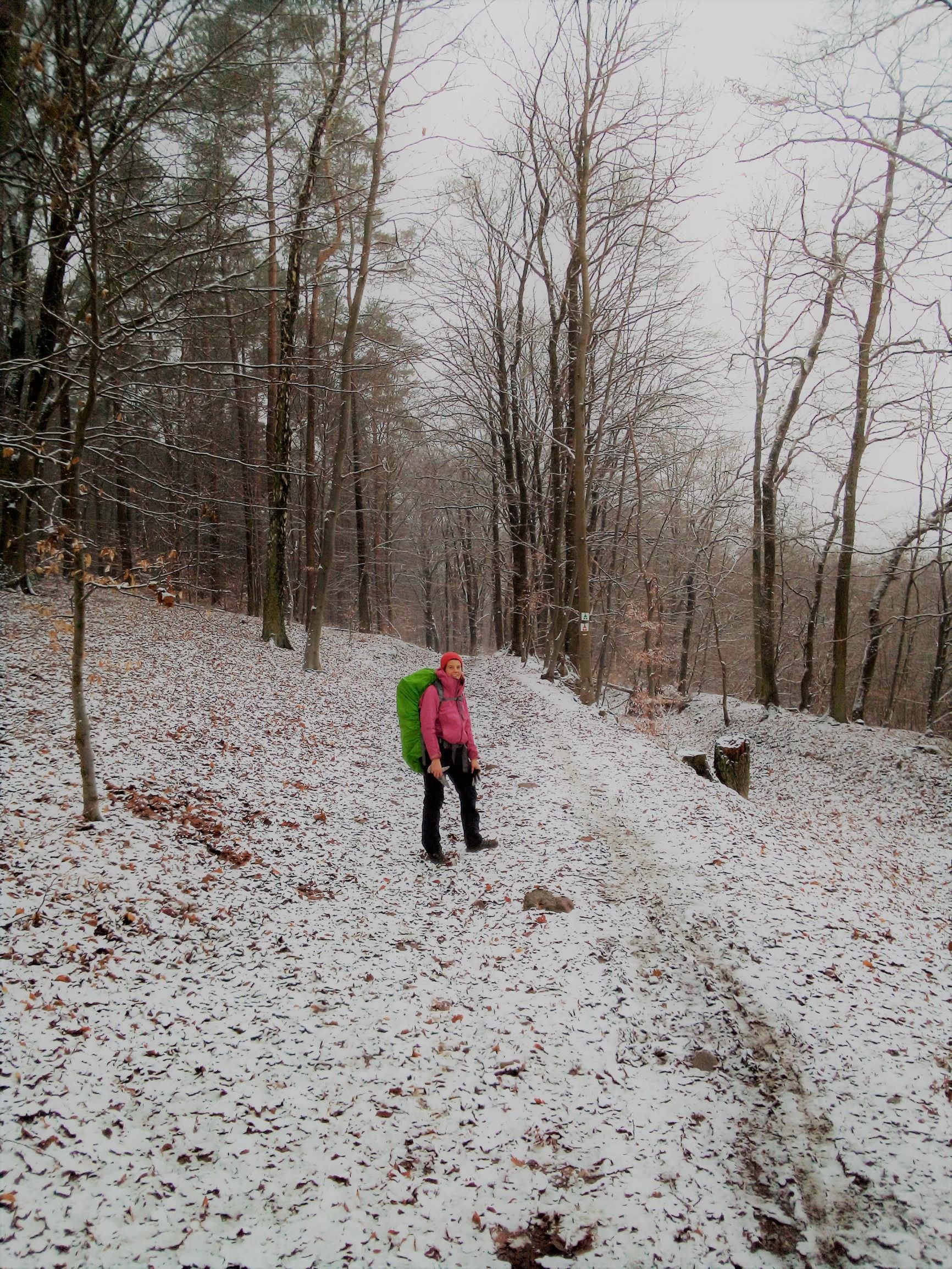 Het is een gevarieerd pad, we wandelen door dichte bossen, eindeloze glibberige veldpaden, op en neer, in de stilte met een laagje sneeuw. De ganse middag zien we ideale plekjes om de tent op te zetten, plat, open, droog, kabbelend beekje in de buurt, maar vanaf het moment dat we een tentplek zoeken is het gedaan met mooie plekjes. Vanaf nu enkel dorpen, verzopen weides, scheve bossen en vooral veel water.