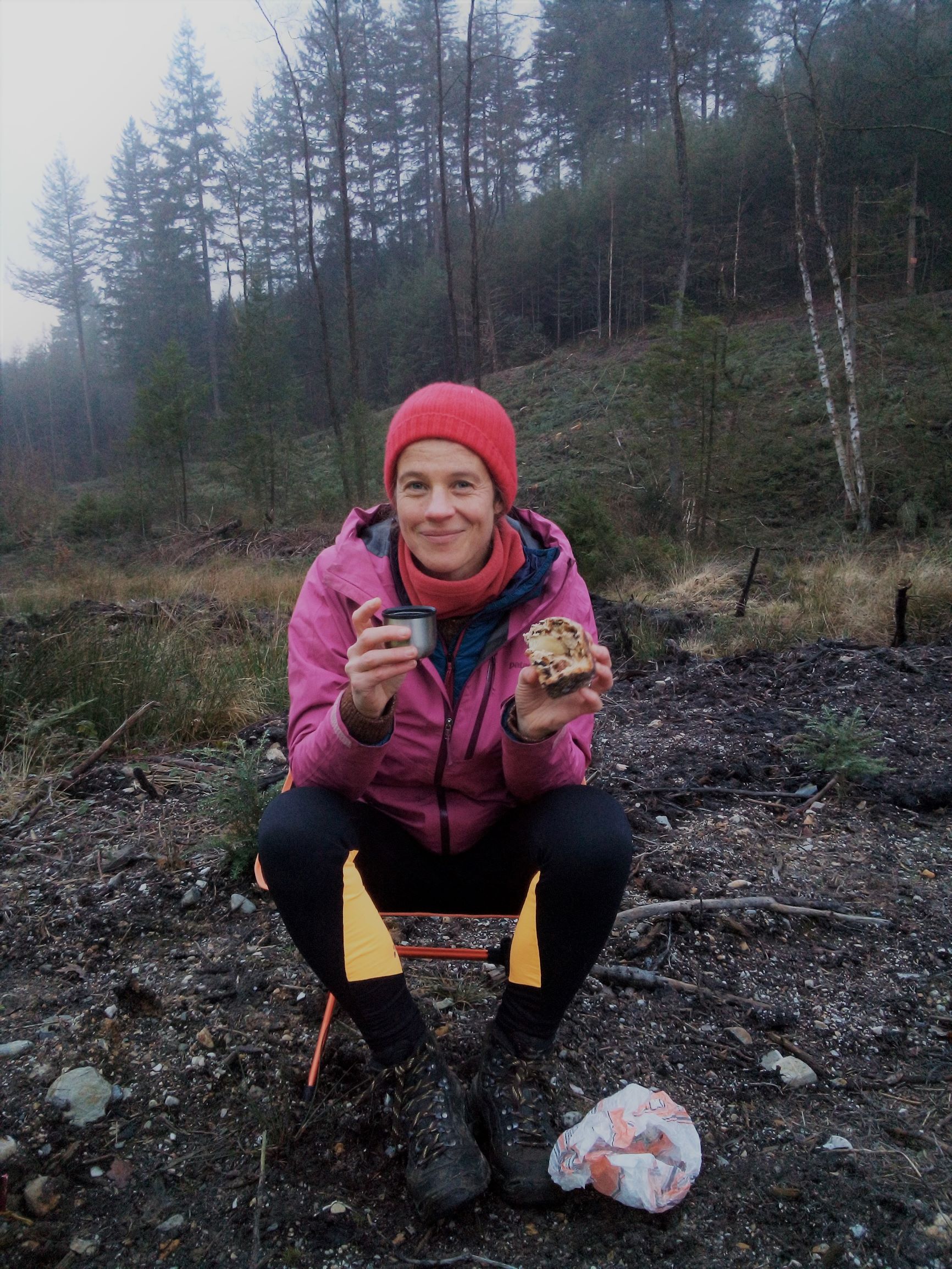 ’s Ochtends zijn de rugzakken bedekt met een fijn ijslaagje. Het ontbijt smaakt, koffie met water uit een beekje, muesli met oplosmelk, kerstbrood van bakker Klaas, een stevig brood, vol vruchten, marsepein en rozijnen en zo naar de rum geurend dat ’t efkes paniek is dat onze fles is uitgelopen in de rugzak.