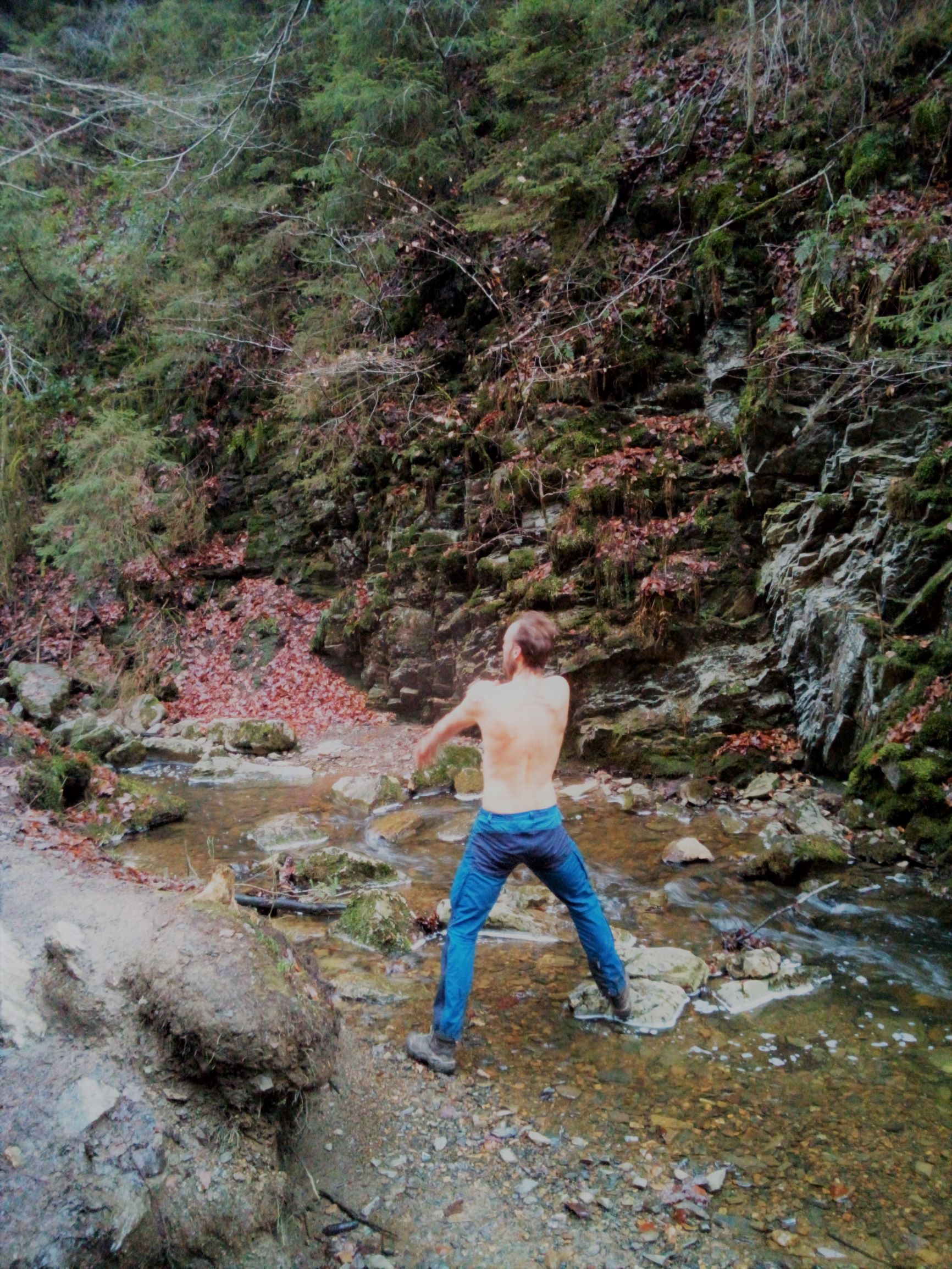 Op een steenworp van onze slaapplek wijzen de nadar hekken en corona boodschappen ons erop dat we de Ninglinspo-ravijn naderen. Om een volkstoeloop te vermijden mag je de site enkel betreden als je in de streek woont of een overnachting hebt geboekt in de buurt. We vinden dat we wel een soort overnachting in de buurt hadden en op een modderbad aan de bosrand zijn er geen obstakels die de toegang verhinderen. Het is er zeer rustig, het is een grijze koude dag, we lopen het eerste stuk quasi alleen en komen op het ganse traject misschien 20 wandelaars tegen. We liepen hier allebei in de zomer van 2019 de ohm trail op een snikhete junidag. Toen waren de dagjesmensen een bijkomend obstakel, op elke steen lag een handdoek en in de baden speelden kindjes en dobberde volk. Vandaag is het ietwat anders, het is 30 graden kouder, winter, nat en glibberig. De watervalletjes en poelen zijn vol en wisselen elkaar snel af door dit prachtig stukje Belgische natuur.