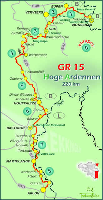 In Eupen staan de rood/witte merktekens alle richtingen op, een waar kruispunt van GR’s. Het horloge met ingeladen route komt van pas en we zijn direct en route in de goeie richting. Na een km of 2 langs een drukke weg duiken we het bos in en is het rustig en stil.