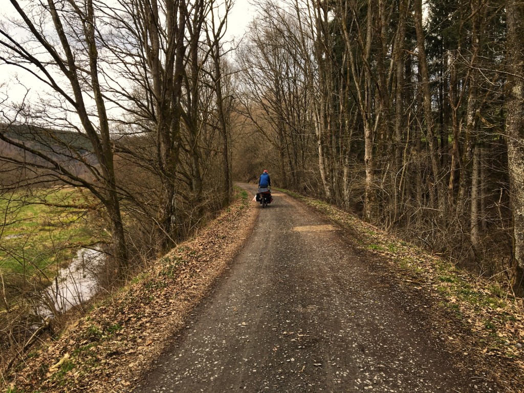 Nabij Burg Reuland fietsen we de Vennbahn op. Vennbahn betekent letterlijk spoorweg van de venen en verbond ooit de industriële centra van Aken en Luxemburg. De spoorlijn werd geasfalteerd en zo ontstond een geasfalteerd autovrij fietspad van 125km lang. Het is er zeer gemoedelijk fietsen. Er kabbelen overal beekjes langs het pad met ideale picknickplekjes en er zijn op verschillende plaatsen ligzetels en bankjes geïnstalleerd maar helaas, de arctische wind blijft ons geselen en doet ons rechtdoor rijden richting Sankt Vith.