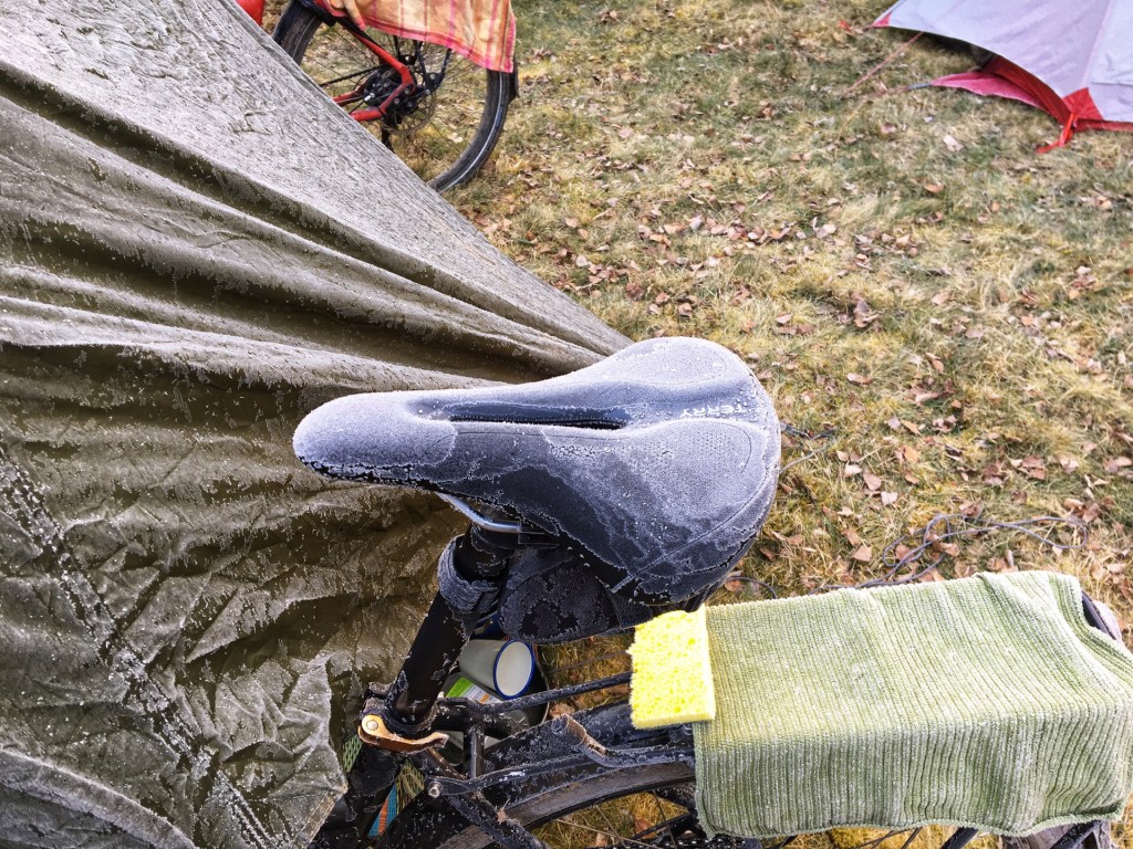 ‘s Morgens is het gaas van onze binnentent bedekt met een flinterdun laagje ijs, bevroren condens. Ook de fietszadels en het zeil waaronder onze fietszakken liggen hebben een ijslaagje. De drinkflessen, de spons en de natte handdoek zijn bevroren.