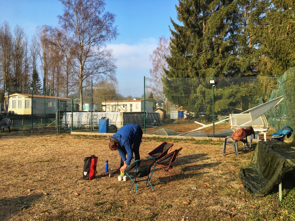 We installeren ons op het petanque veld in de zon en hangen alles wat wak, nat of bevroren is te drogen. Ondertussen zetten we een koffietje, eten muesli met yoghurt en warmen op in de ochtendzon.