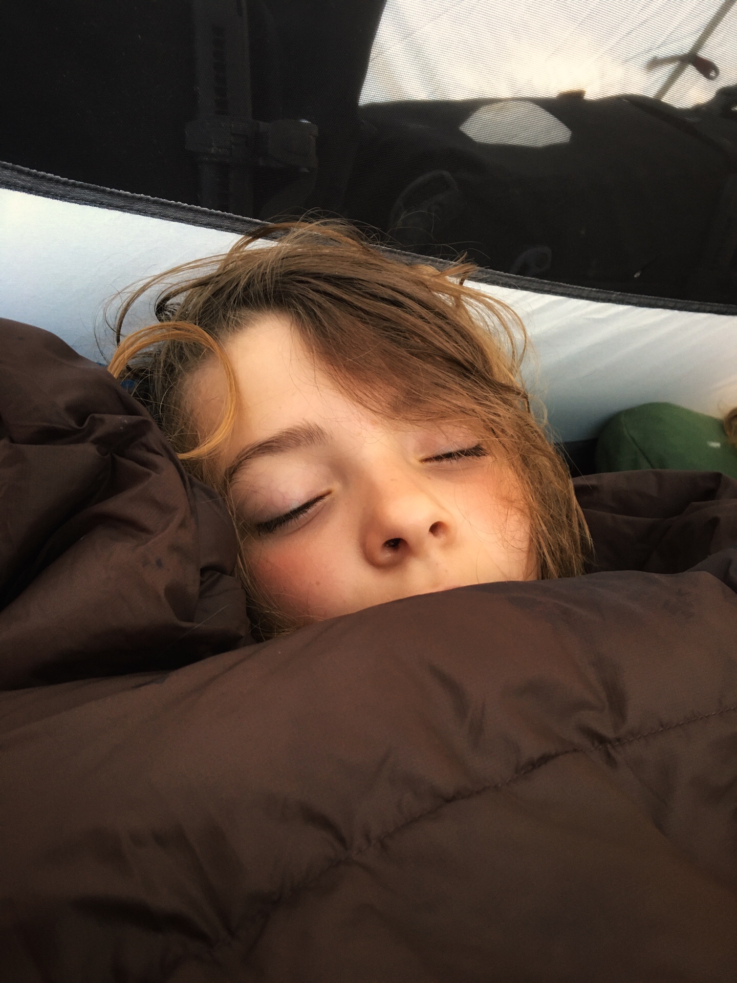 We slapen in ons tentje bij -4. Het is steenkoud, iedereen kruipt helemaal weg in zijn donsslaapzak, maar houdt het al bij al warm. De kinderen slapen als roosjes in het midden, Bart en ik vormen een front tegen de koude aan de zijkanten.