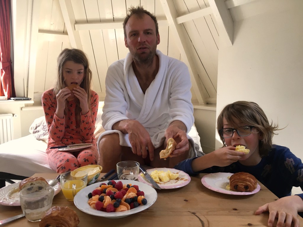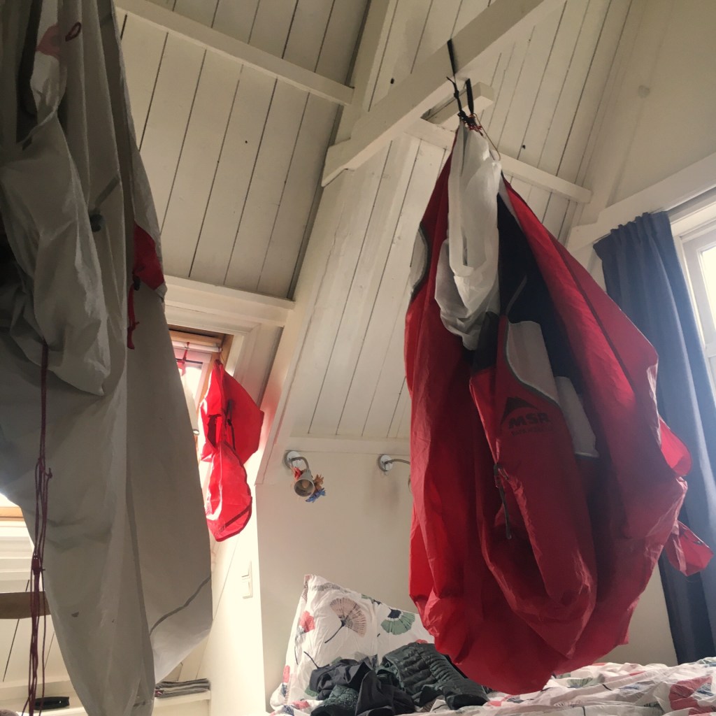 We hebben een Airbnb geboekt wegens te koud, teveel regen en teveel wind. Hopelijk is het de regen voor zonneschijn. De Airbnb is de bovenste verdieping van een huis. Het is er klein maar heel gezellig. Er is geen keuken. We brielen wat met eieren in de microgolf en eten tapa’s op het tapijt. En er is Yvonne, ze doet de afwas, steekt de fietsen onder een zeil, staat haar badkamer af want die heeft een bad en die van ons niet. Onze kamer hangt vol met tentzeil te drogen, home sweet home…