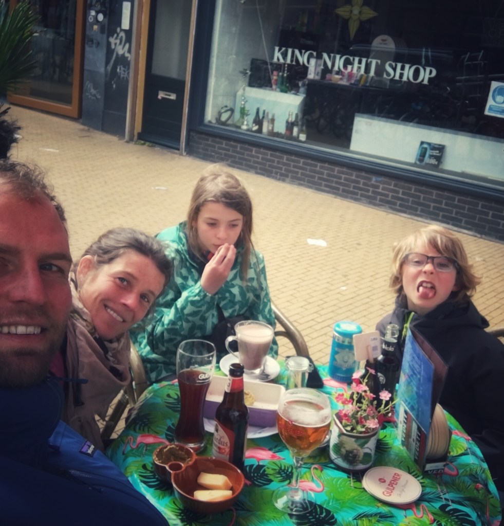 Groningen is instant love. Een jonge stad met veel studenten, kleurige senioren, fietsen, lage bebouwing, schattige gevels en het leeft er! We slenteren rond en genieten van de kleine binnenstad, de mooie gevels, de onverwoestbare Martinitoren waar ze heel trots op zijn, het water met zijn hoge en lage kade, tweedehands klerenwinkeltjes, de vibe van een artistieke studentenstad… We doen een paar essentiële aankopen en een terrasje of course!