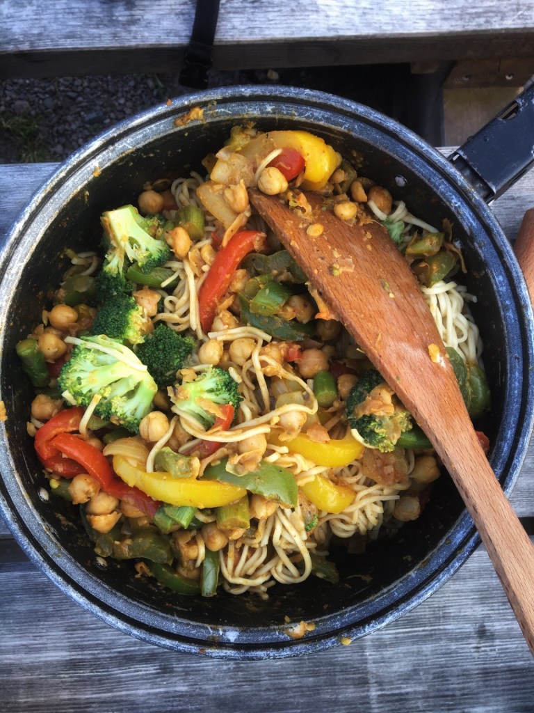 En dan moet het mooiste nog komen. Op de kaart vinden we een parkinkje naast een natuurreservaat, Kråkeryd. Er staat geen bordje dat er niet gekampeerd mag worden, dus mag het. De parking is plat. En er is een toilet. En een picknick bankje. En Bart kookt een heerlijk maaltje.