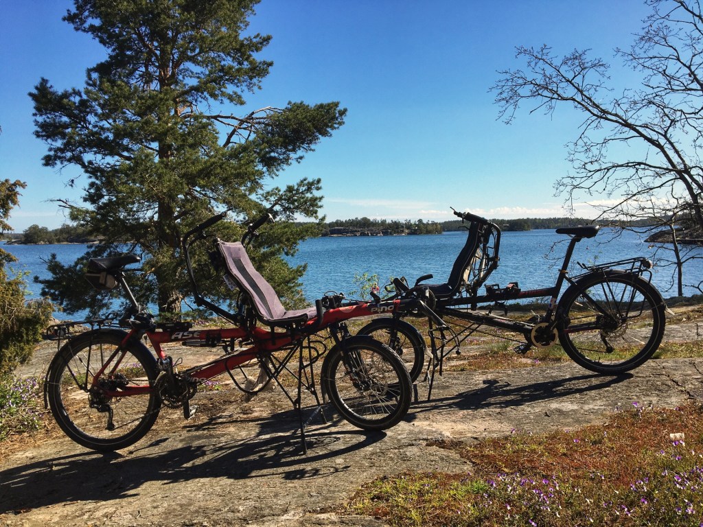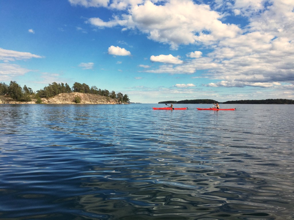 Het is prachtig in de archipel. Ze ligt bezaaid met weelderige rotseilandjes die een groot Peter Pan gehalte hebben. Afgesleten rotsen begroeid met bomen en struiken stijgen uit het water. Het water is minder zout dan de zee en minder koud dan de meren waar we al in geplonsd hebben.