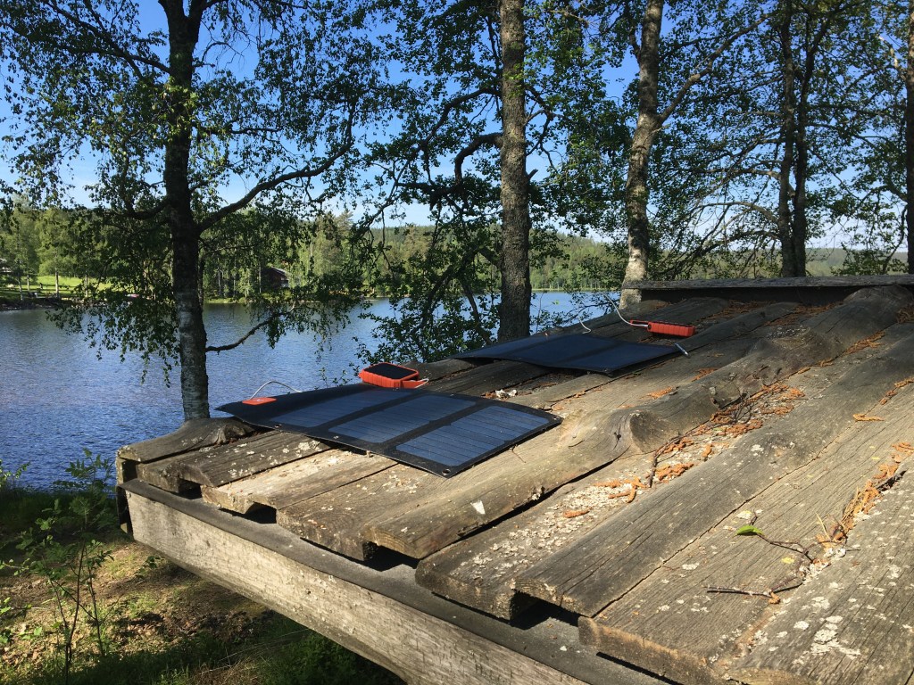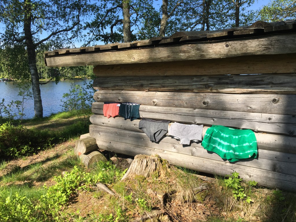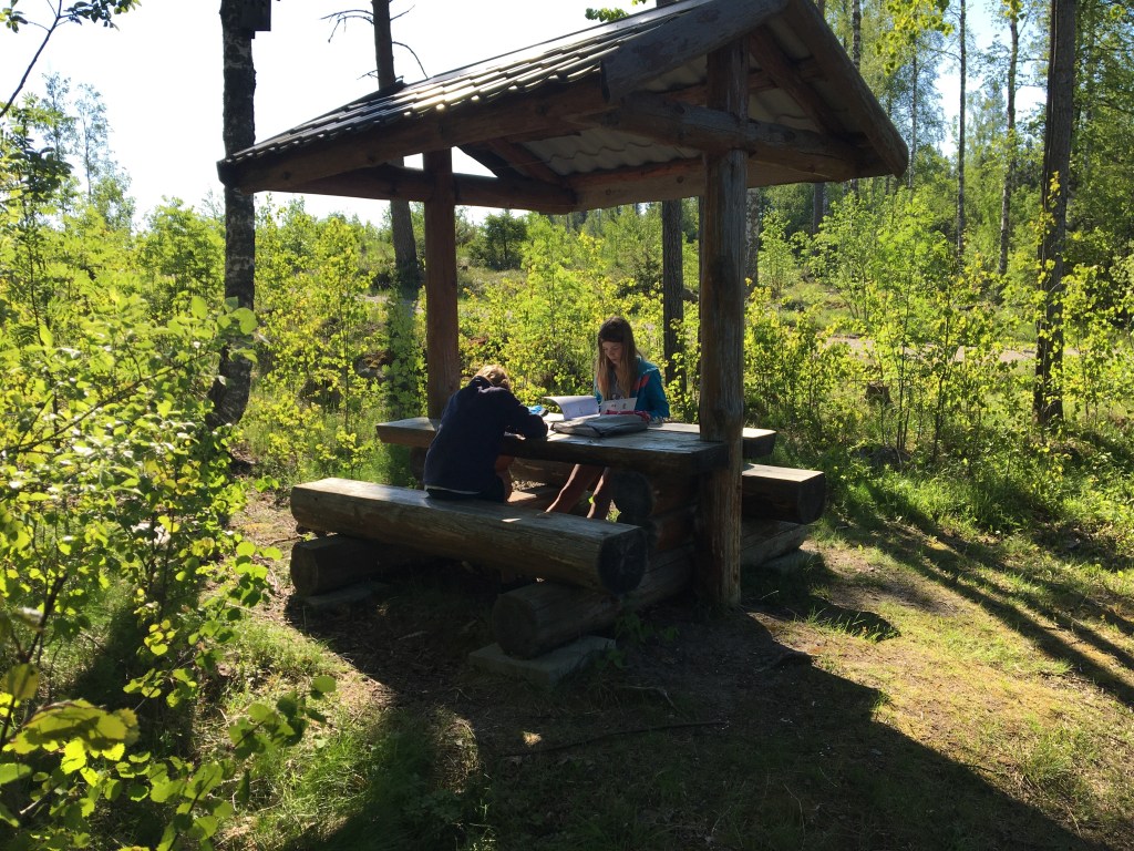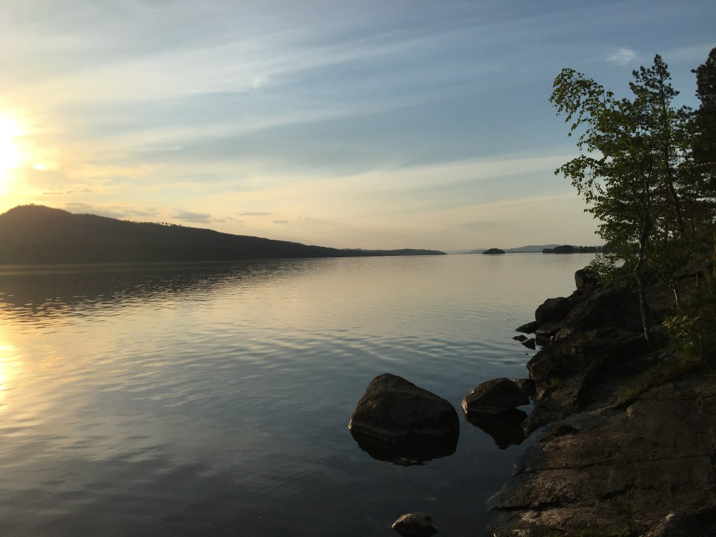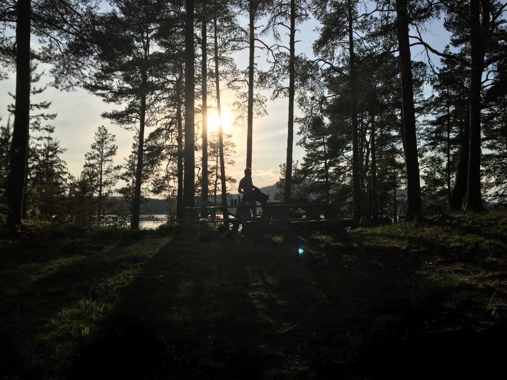 Na de lunch en de dagelijkse supermarktstop willen we nog een 12 km fietsen en een kampeerplaats zoeken. Geen vindskydd op onze route vandaag. We rijden nog maar eens langs een groot meer en perfect op ons pad is er een afslag naar een schiereilandje. Er staan een paar huisjes en dan is er een grote parking met daarachter een tuin van Eden. Een prachtig glooiend park met dik zacht gras, fruitbomen, een klokkentoren, een groot kruis en een Zweedse vlag.