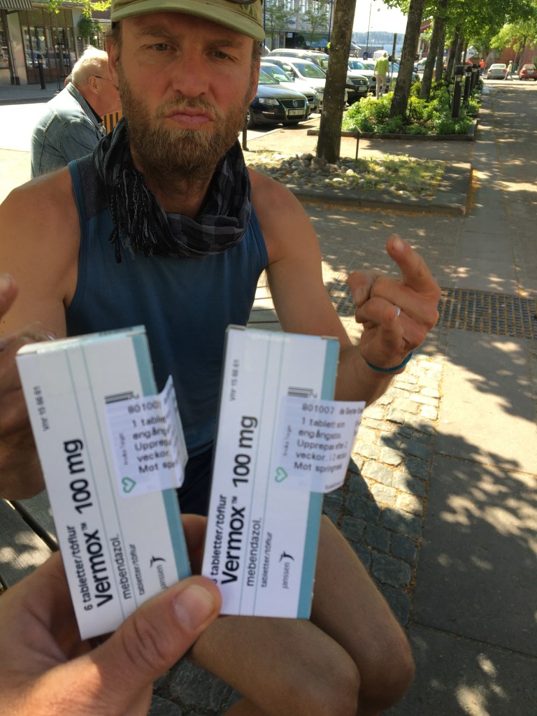 De ochtend staat in teken van een blitzbezoek aan de volkskliniek van Arvika. We hebben medereizigers! Wormen! De kinderen hebben wormen in hun kak, witte wriemelende wormen. Ze vinden dat zeer fascinerend en praten over bijna niets anders dan over die wormen. Een bezoek aan de apotheek levert niets op. Zonder voorschrift, geen medicatie. En zo zitten we om 11u stipt met de ganse familie in de wachtkamer van de volkskliniek en een kwartier later staan we buiten met een voorschrift. We vieren de actie met een grote ijscrème op een plein. En een pilletje.