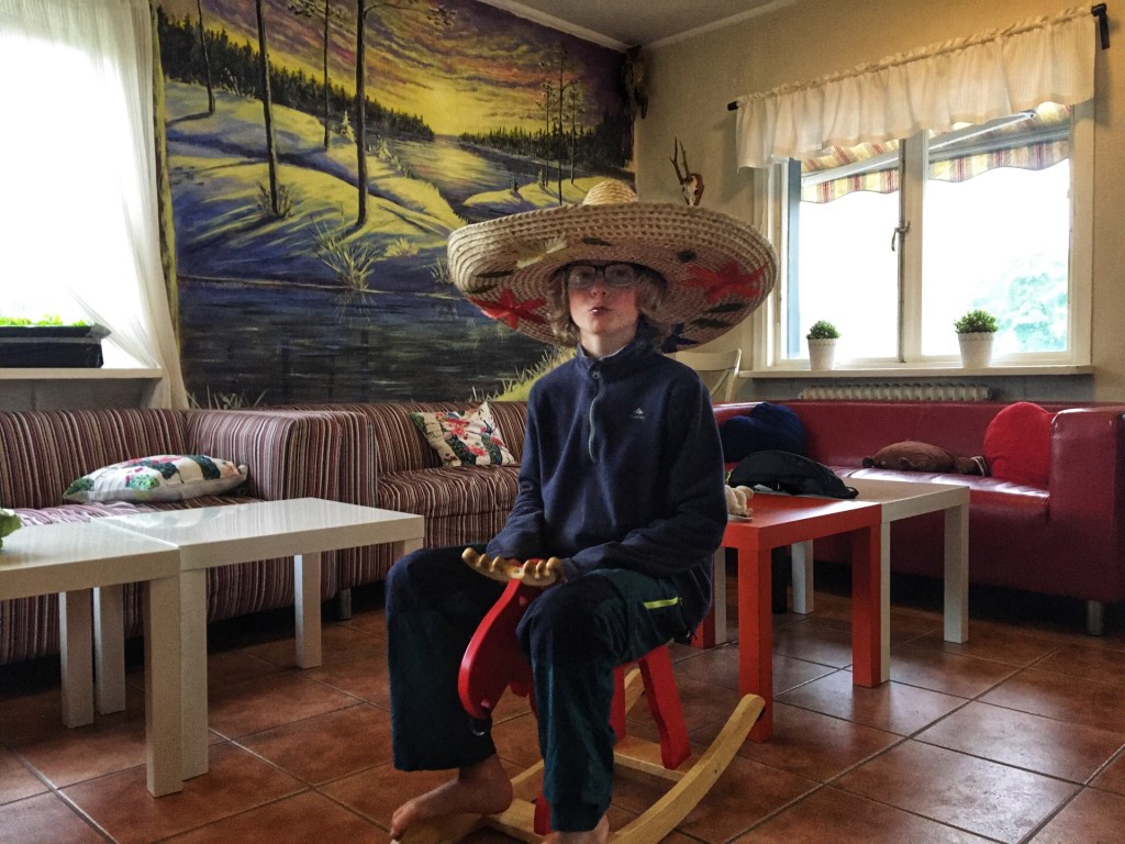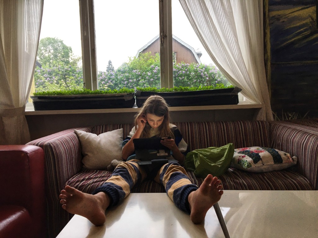 Ik blijf fietsen, fietsen en fietsen met Ramon die de JBL box onder zijn regenjas houdt waaruit Tourist gesmoord klinkt. Fietsen op adrenaline door de bliksem en de donder. Ik kan pas stoppen met trappen wanneer we Fredriksberg binnenrijden en ik het flikkerende neonlicht van een pizzeria zie. De pizzeria, onze veilige haven in regendagen! Bart en Nanou zitten een stuk achter. Nanoutje zonder regenbroek. Die zit nog bij mij op de fiets, aiaiai… Ramon en ik drinken een koffietje en een theetje (en eten elk 2 chocoladebommen) in de pizzeria. Wanneer Bart en Nanou binnendruppen nemen we een biertje, een sapje, we kleden ons om en bestellen uiteindelijk pizza en burgers.