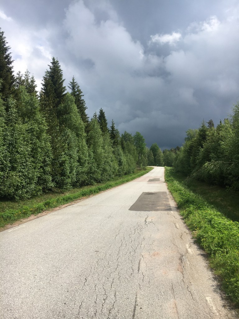 De rit gaat vlot. Glooiend, goeie asfalt, aangename temperatuur en een heel rustige weg. We zitten ondertussen in Dalarna en komen nog maar weinig verkeer tegen.