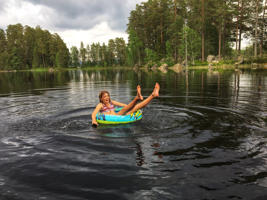 We rijden naar een hut vandaag, aan het Storsjön meer in Snöå. Het is er weeral niet slecht. Een meertje, een steigertje, een avondzonnetje. Nanou en Ramon zijn niet weg te slaan van de meren. Ze zwemmen, dobberen en plonzen waar en wanneer ze maar kunnen.