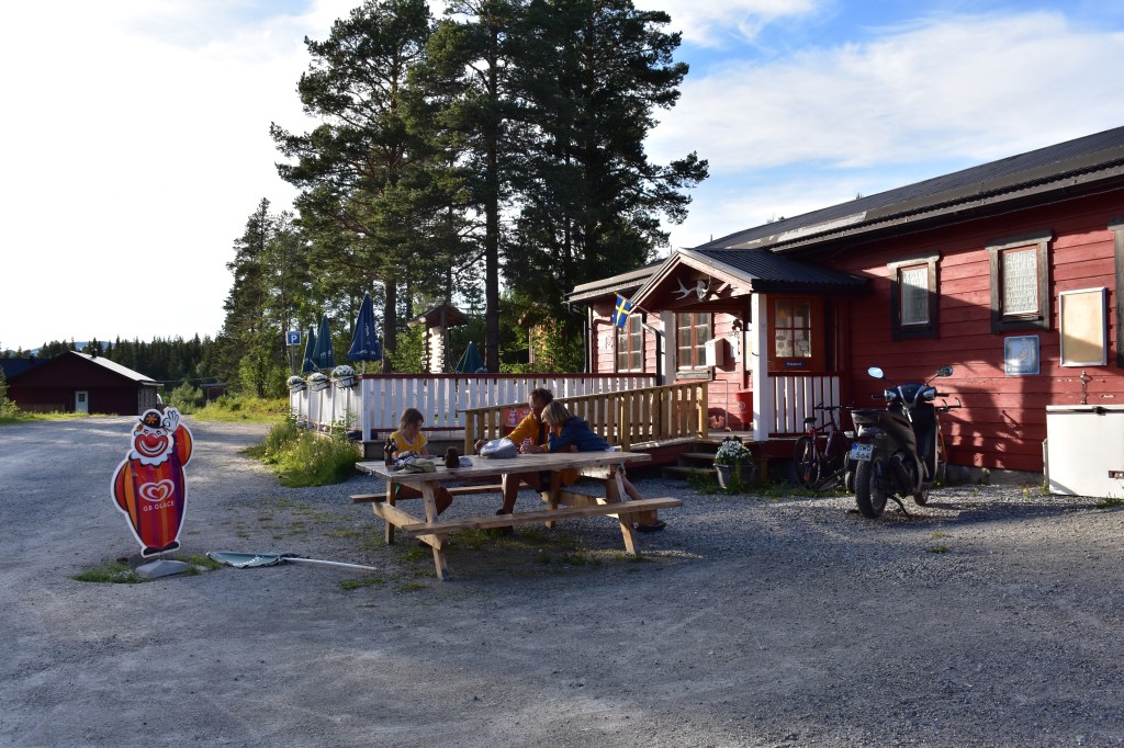 De rit begint met een stevige afdaling. Bart heeft mijn remblokken ververst op het plateau dus dat zit snor. We snorren naar beneden tot in Skärdalen. Daarna volgt een venijnige klim naar Ljungdalen. Aargh! Suikerdip! Snicker. Aargh! En we zijn boven. Ljungdalen is een petieterig dorp met prachtige rivier en startplaats voor de beklimming van de Helags. Met zijn 1796 m is hij de hoogste berg van Zweden onder de poolcirkel. Het wandelen in Grövelsjön is ons zo goed bevallen dat we ook hier een trekking willen doen. Om te trekken hebben we rugzakken nodig. Dat is onze missie voor vandaag.