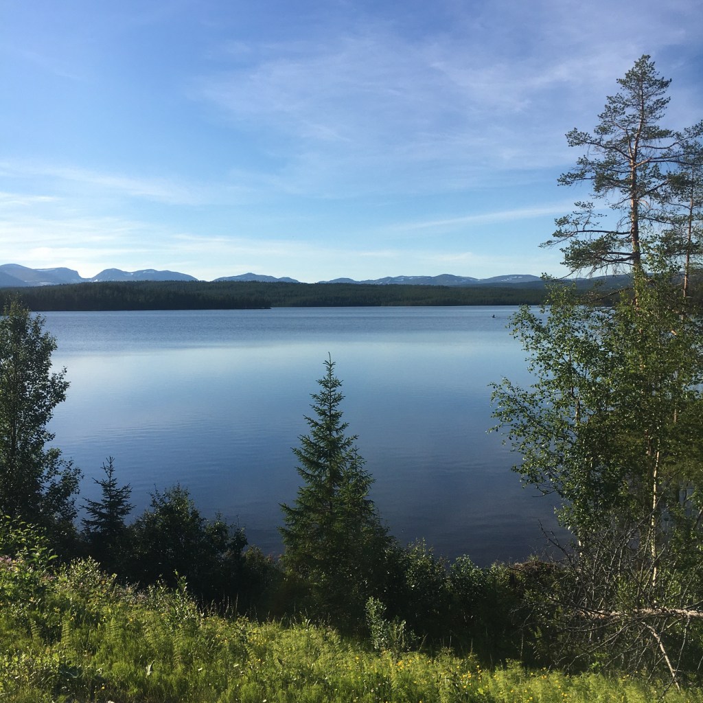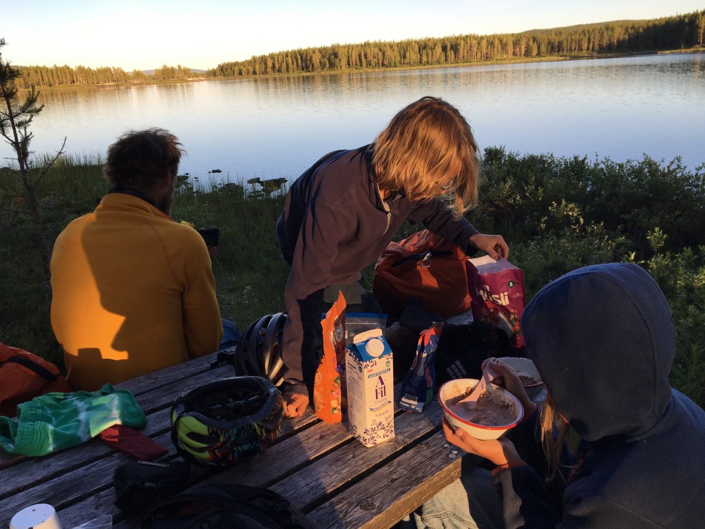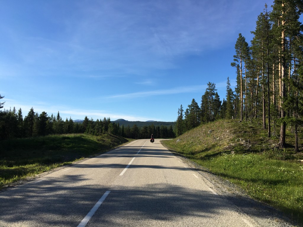 We beslissen om in de late namiddag in te pakken en nog een 30 km te fietsen in de avondzon. En dat is echt prachtig. De warme avondzon maakt onze schaduwen lang en brengt een donkergele gloed. We laten de Zweedse bergen achter ons en zijn een beetje melancholisch.