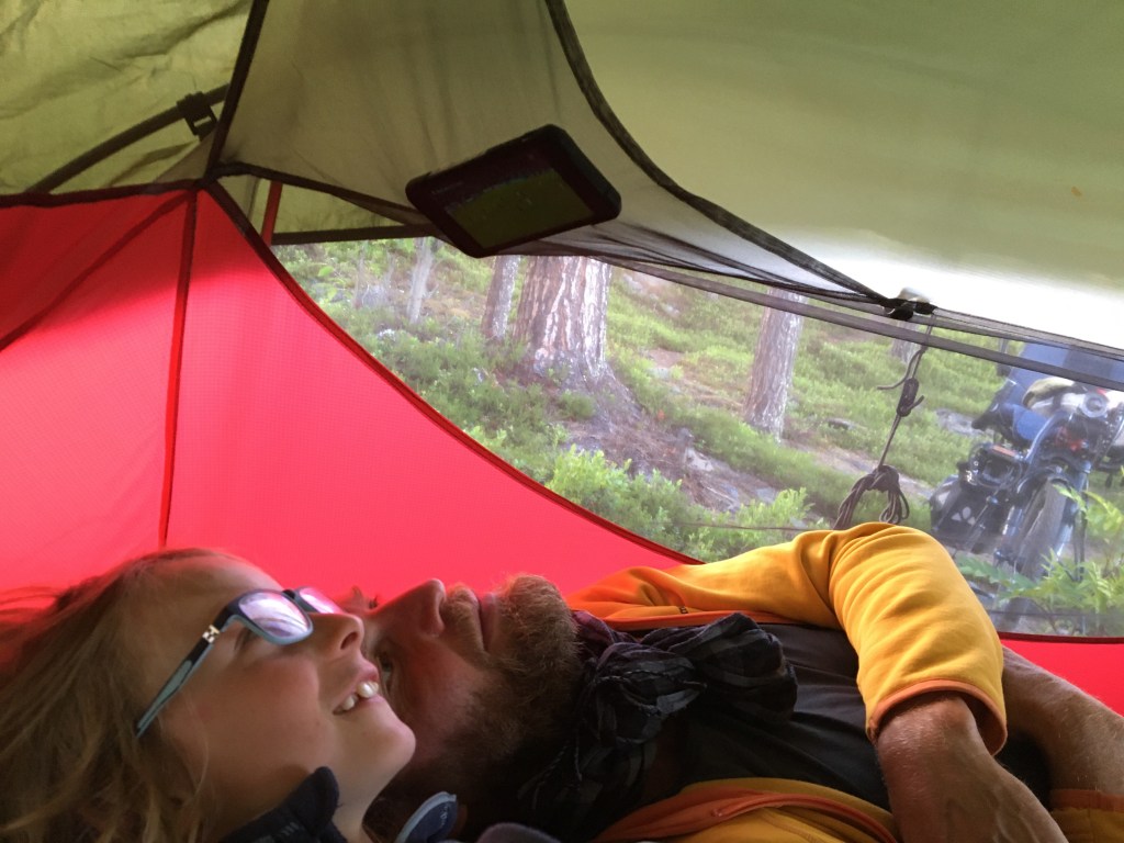 Aan een meertje zetten we onze tent op en kruipen er snel in om te ontsnappen aan de insecten.