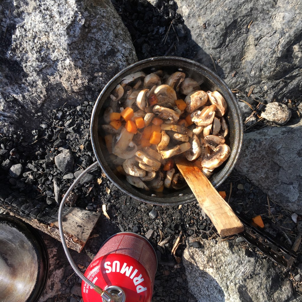 Met een lege maag de dag beginnen is geen goed idee. De winkel is verder dan gedacht. Ik wil wachten met ontbijten op de winkel met een luxe maaltijd in gedachten, Bart trekt op 8 km van de winkel met scheurhonger aan de noodrem. We eten voor de winkelstop muesli met oploschocomelk en water in een bosje langs de weg. Er zijn geen muggen, er is veel honger, 1 kilo muesli in 1 keer op.