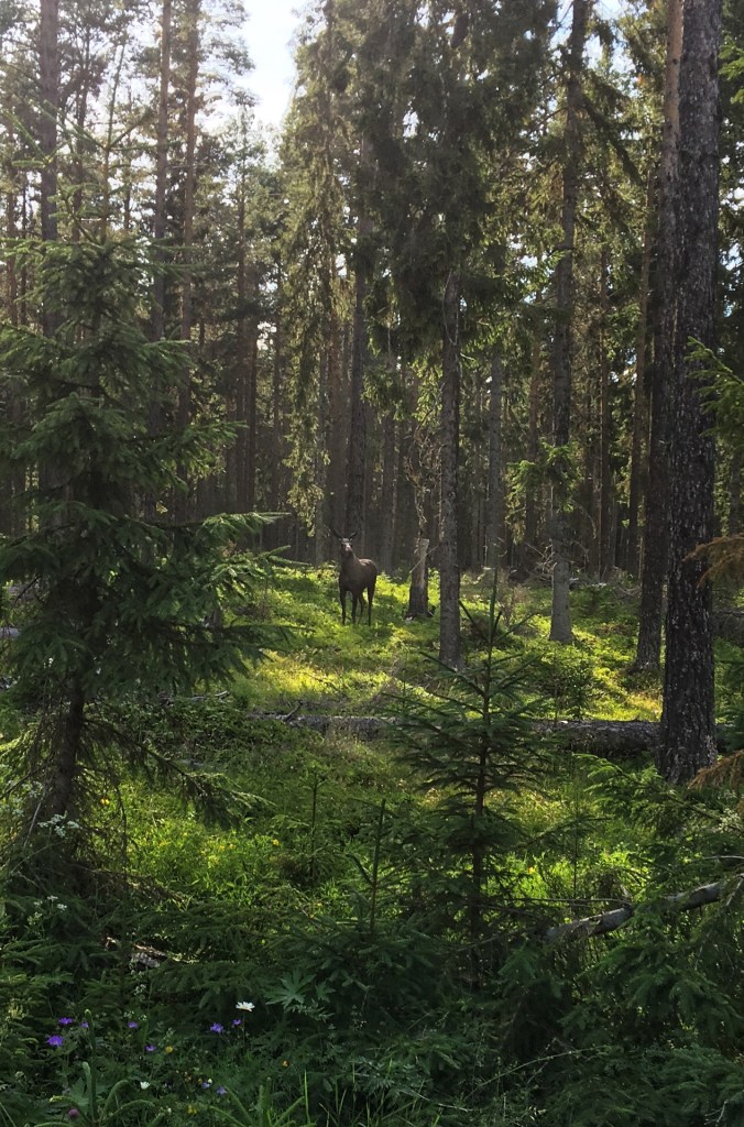 Ik had gevreesd dat we over de koppen zouden lopen op Andersön maar dat is niet het geval. We rijden het eiland rond en plots merkt Ramon een eland op tussen de bomen naast ons! Een Moose! We blijven kijken tot hij elegant de benen neemt.