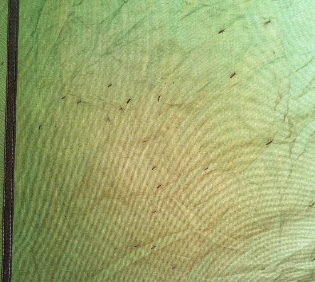 Iedereen slaapt zeer goed onder het gezoem van de muggen en de knotts. Tegen de ochtend zijn de knotts gelukkig verdwenen. We moeten enkel de muggen wegslaan. En dat is makkelijker gezegd dan gedaan. Nog nooit zijn we ergens zo snel vertrokken. We drinken maar 1 koffie (rondlopend over de weg) en met lange broek en mouwen en sjaal in de haren en veel spray ruimen we in een half uur (!) alles op. Ontbijten is onmogelijk. Het is een verschrikking. De kinderen wandelen weg van de fietsen. De zakken, de tent, wij, er hangt een zwerm rond, het is niet te doen. We rijden net niet gillend het plateau af.