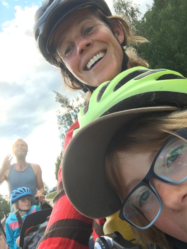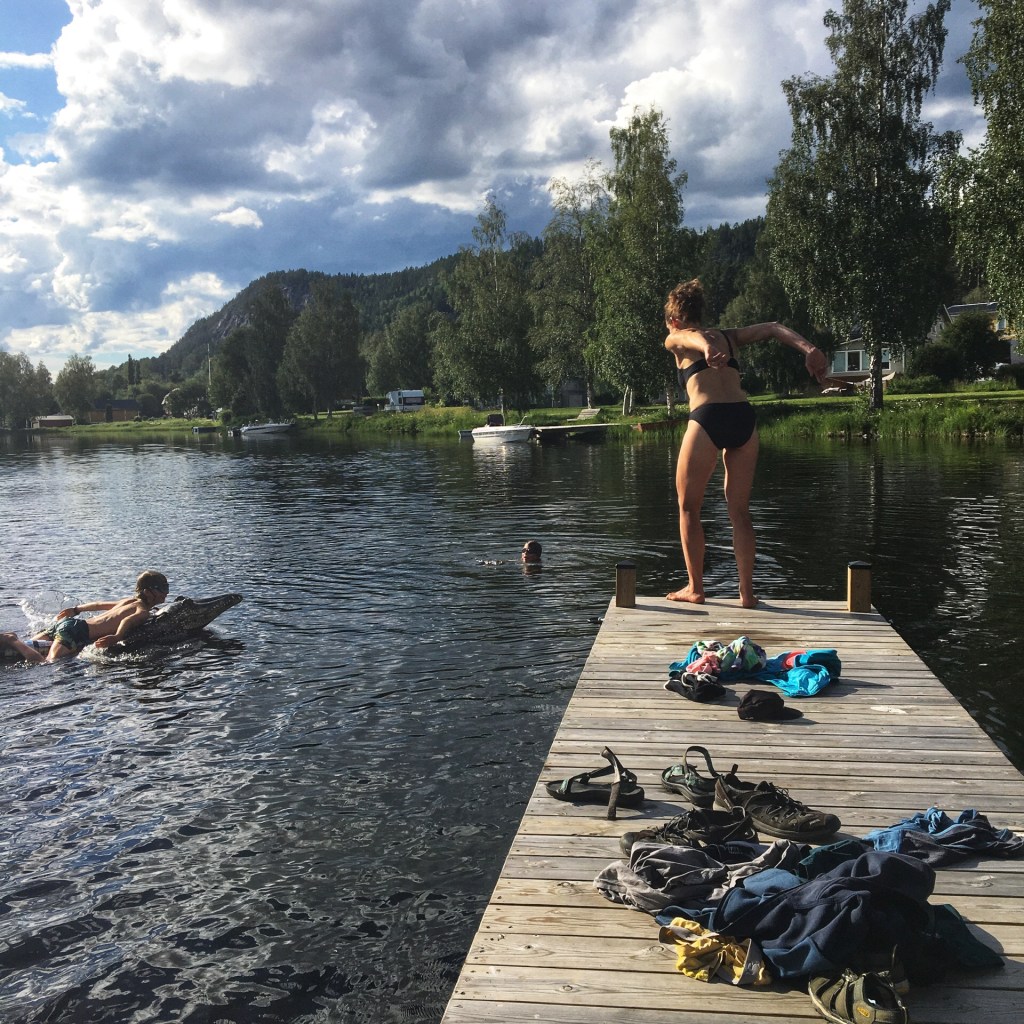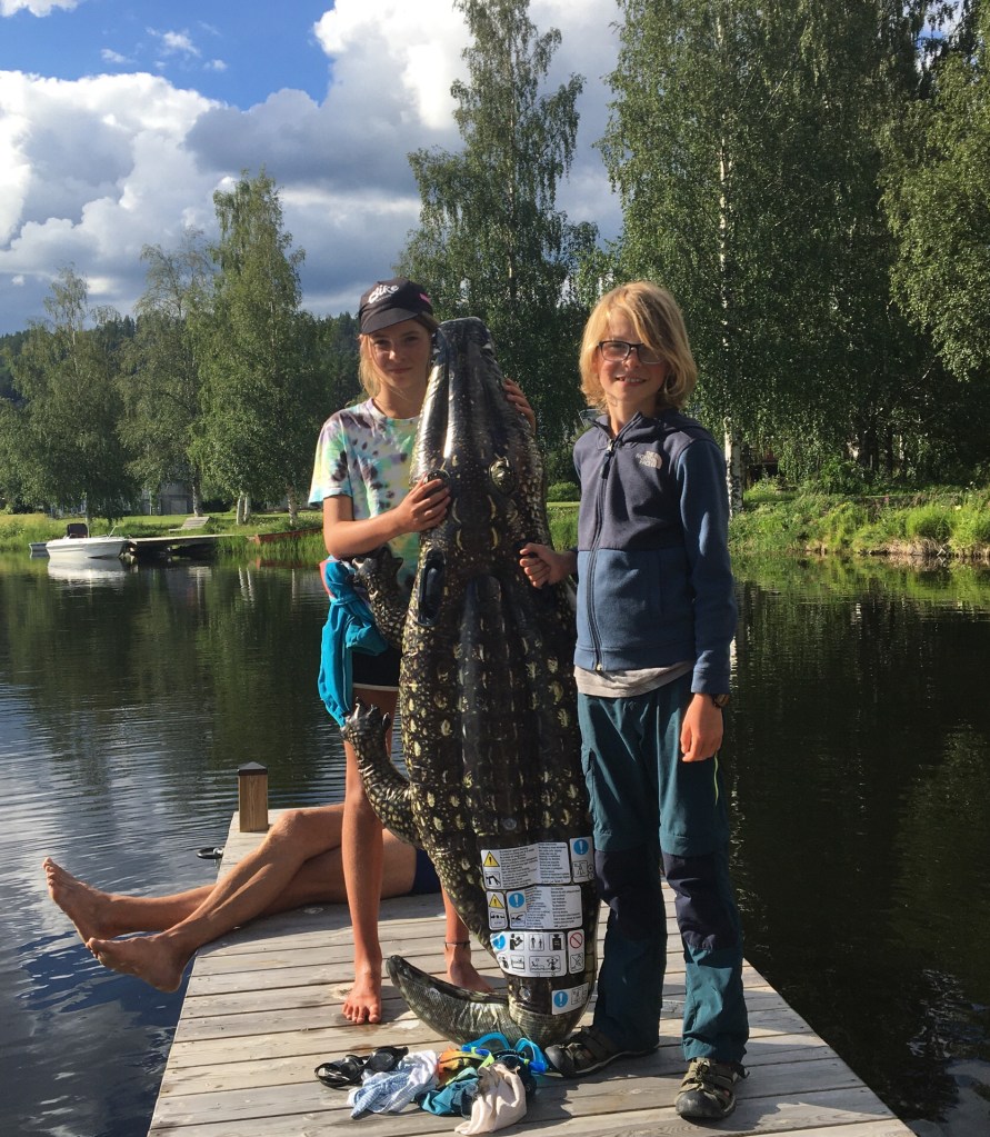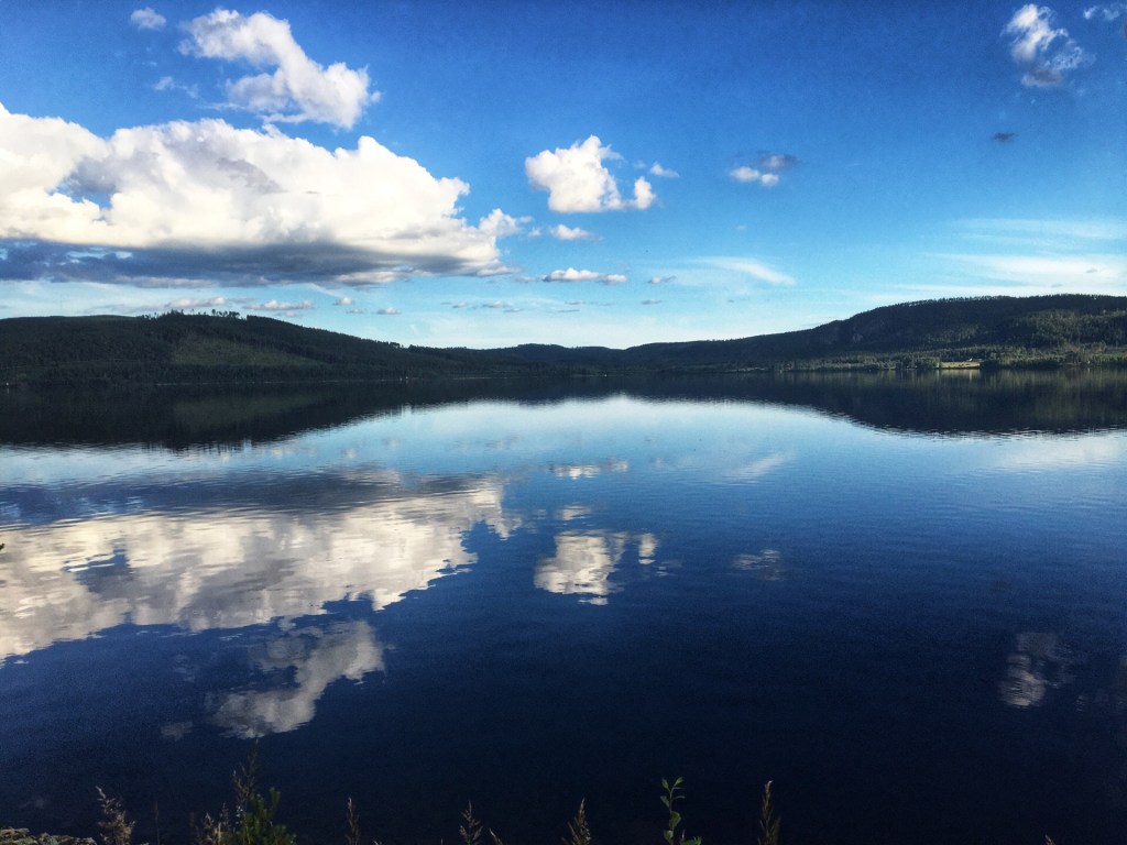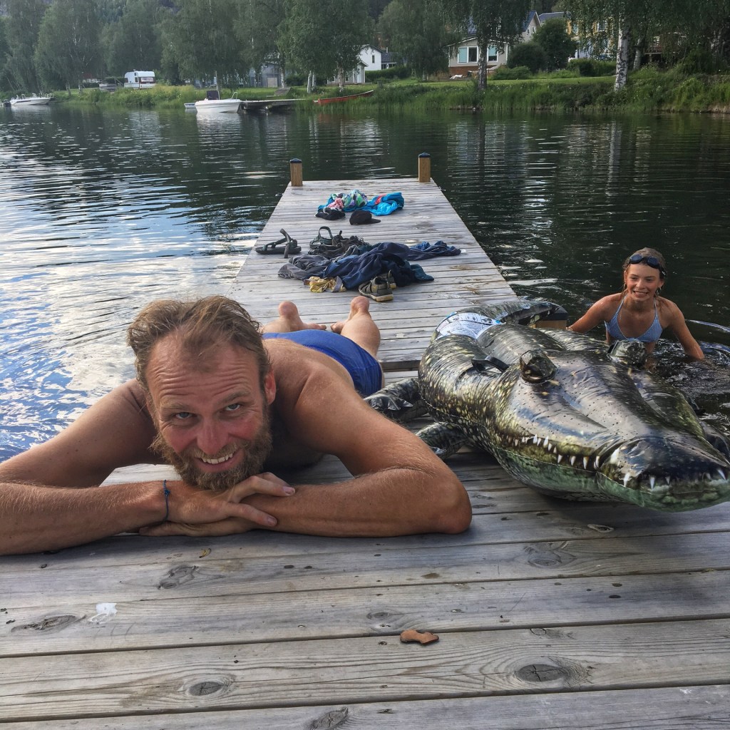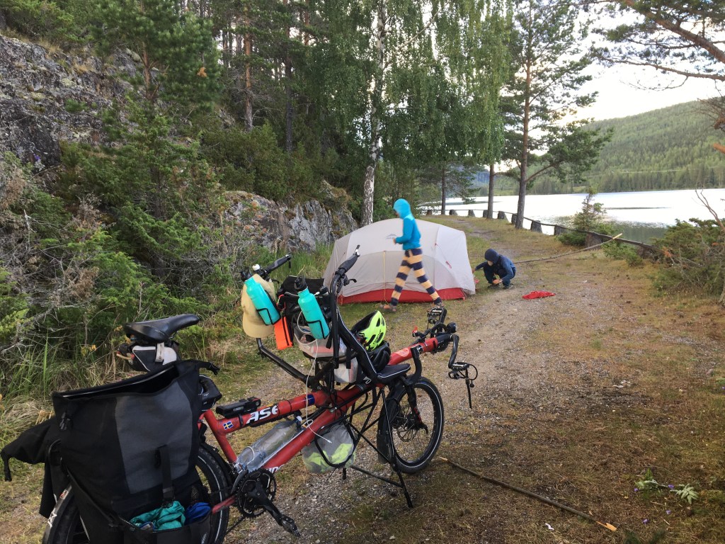 We fietsen het eerste stuk over een skipiste en dat is een heftige start van de dag. Zweten in de zon en puffen op de hellingen. Daarna nemen we een hoofdweg en die volgen we de rest van de dag. Er is weinig verkeer en de Zweden zijn zeer galante chauffeurs. Ze schuren niet langs je en laten veel ruimte bij het inhalen. De weg is ook uitstekend om kilometers te maken. Na 55 km rusten we uit aan een meer (waar anders), drinken een koffietje, de kinderen eten een vieze hotdog, Billy de krodil wordt uitgetest en goed gevonden.