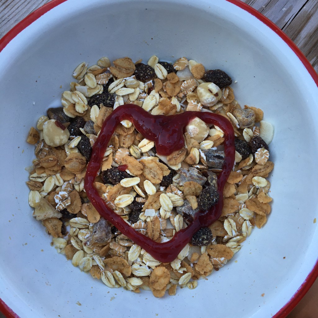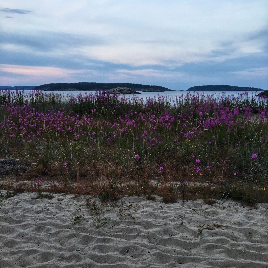 We rijden naar een strandje een kilometer van de haven langs een zanderig pad door het bos. Het strand is een pareltje. Gladde rode warme rotsen aan het water, roze bloemen langs het strand, een granieten muur met dennenbomen die het gekrijs van de meeuwen weerkaatst. Hopelijk gaan die straks ook slapen.