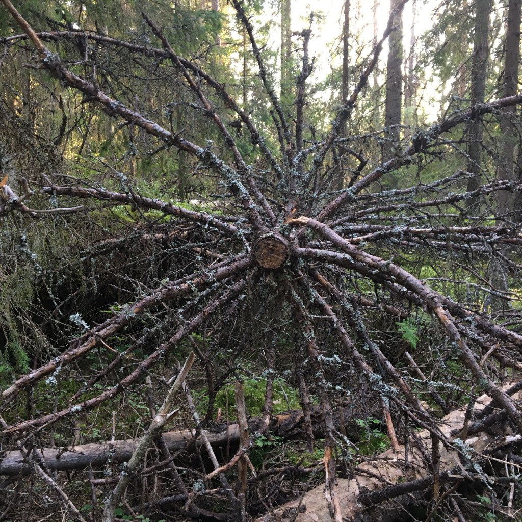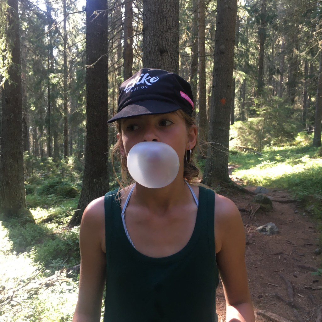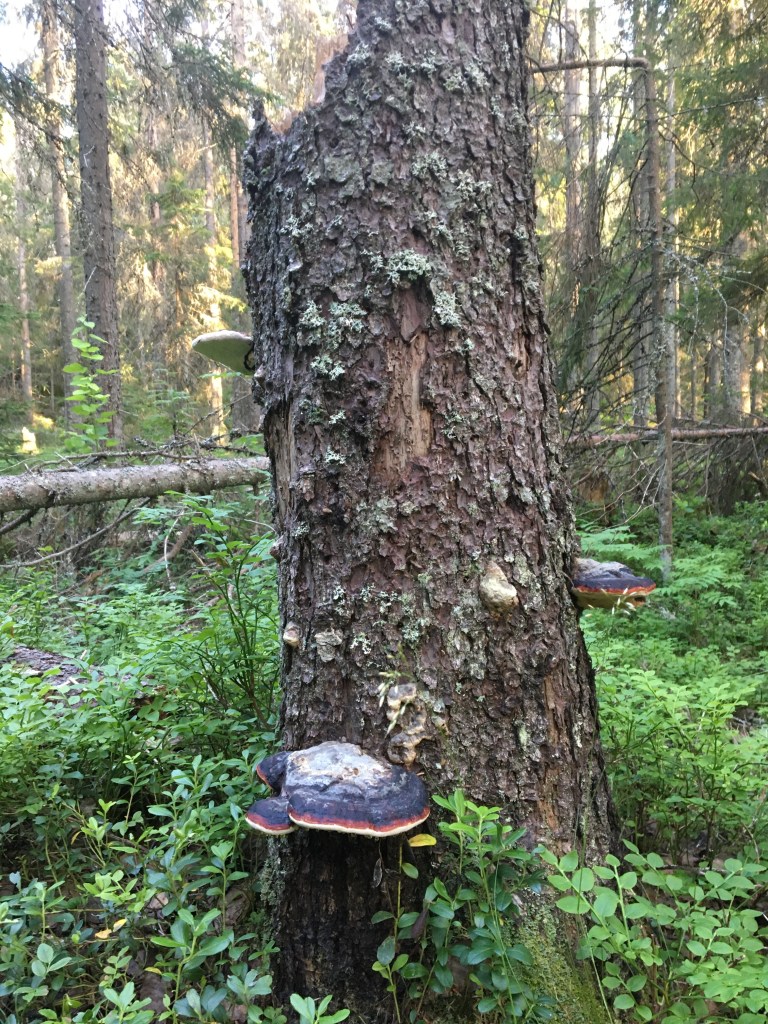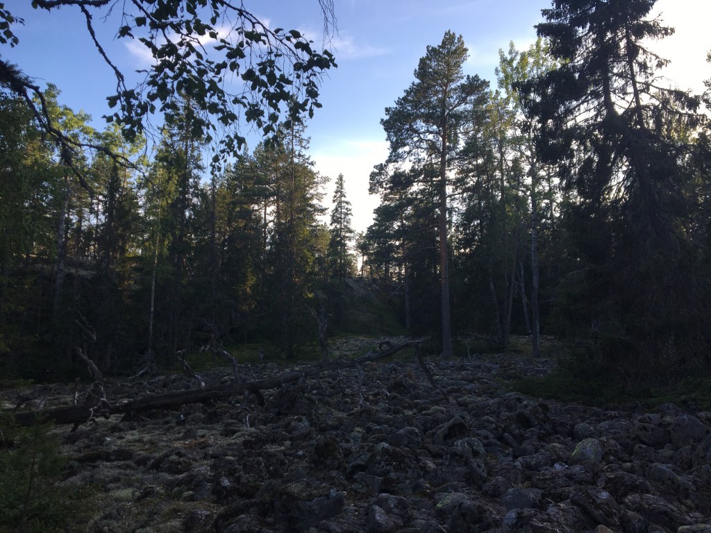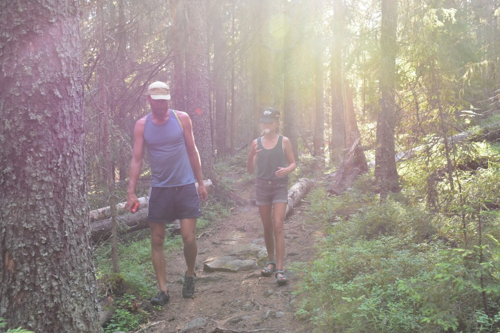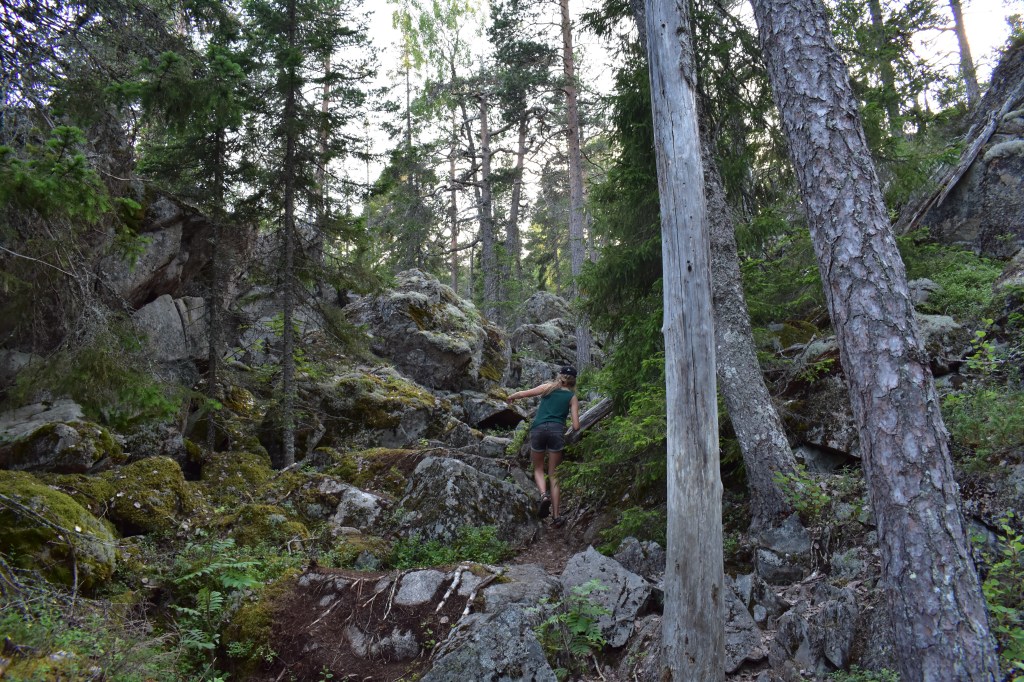 Tent opzetten, uitladen, zwemmen en dan willen we nog naar het Balestjärn wandelen. Het is na 17u als we vertrekken. Nog een paar appels in de rugzak, 2 handdoekjes en weg zijn we. We volgen een stuk van de Hoga Kusten Led, een wandelpad van 128km in dit gebied. Onze weg loopt door het Balesudden natuurreservaat, een glooiend diep sparrenbos met gladde rotsplateaus, dikke boomwortels en gladde boulders. Het is een prachtige wandeling door een oud groen woud met machtig hoge dennen.