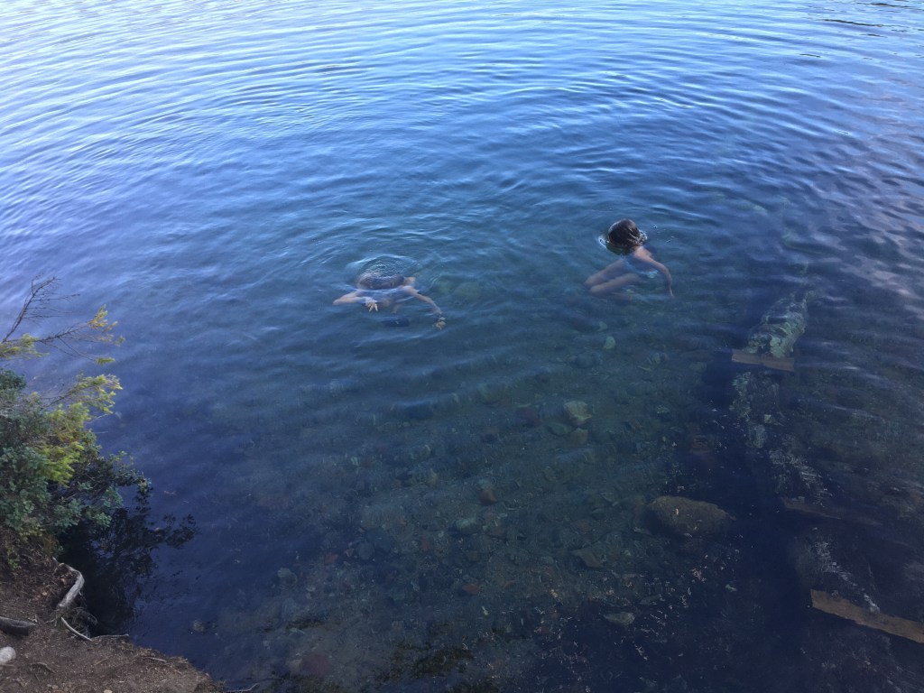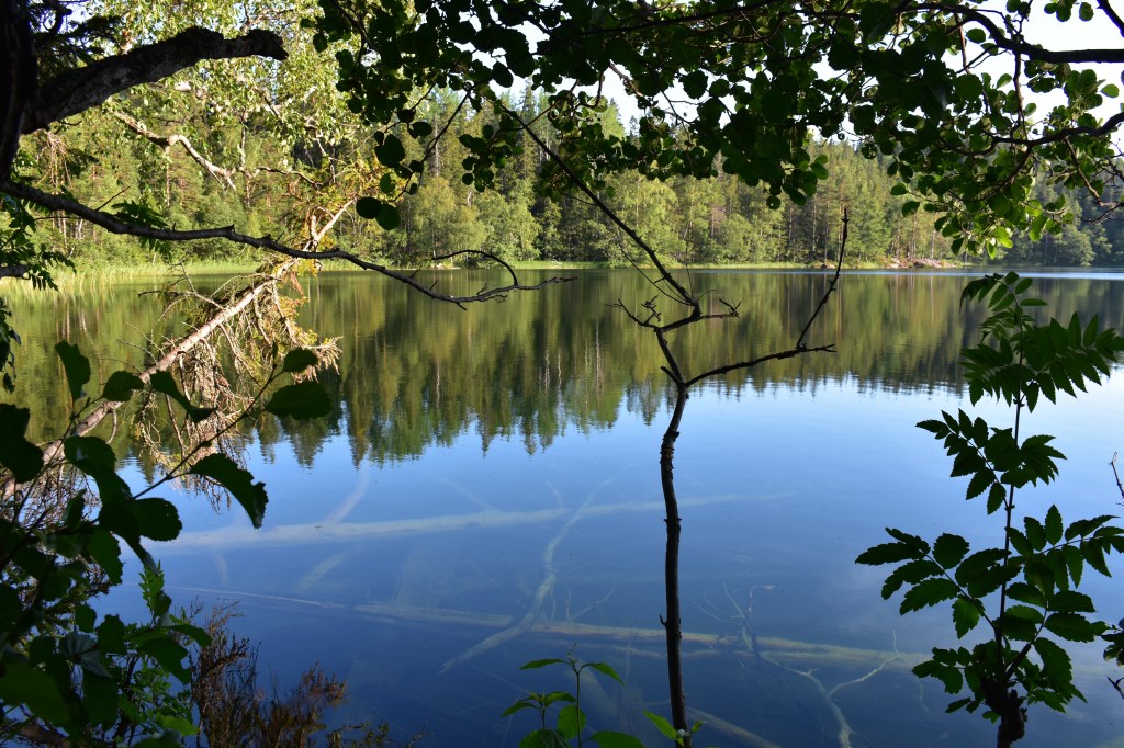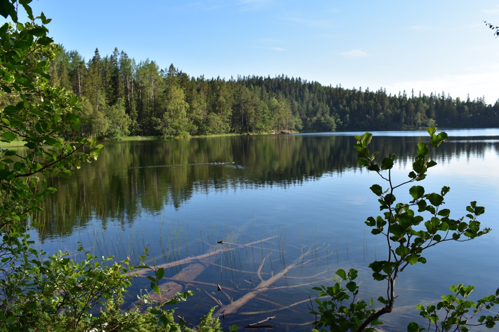 Na anderhalf uur doorstappen komen we bij het Balestjärn, een kristalhelder meer omringd door rode granieten rotsen. In het water zie je oude bomen liggen. Ertussen zwemmen vissen (en onze kinderen).