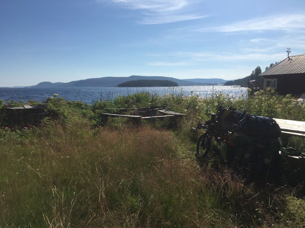 Er staan vandaag niet veel fietskilometers op het programma. We fietsen naar Hålviken, een ritje van 25 km. Daar willen we op een strandje de tent opslaan en wandelen naar Balestjärn, een meer met rode granieten rotsen in een mooi natuurgebied. Vooraleer we voor de laatste kilometers afslaan naar een gravelpad doen we nog een kleine detour naar de supermarkt in Bjasta.