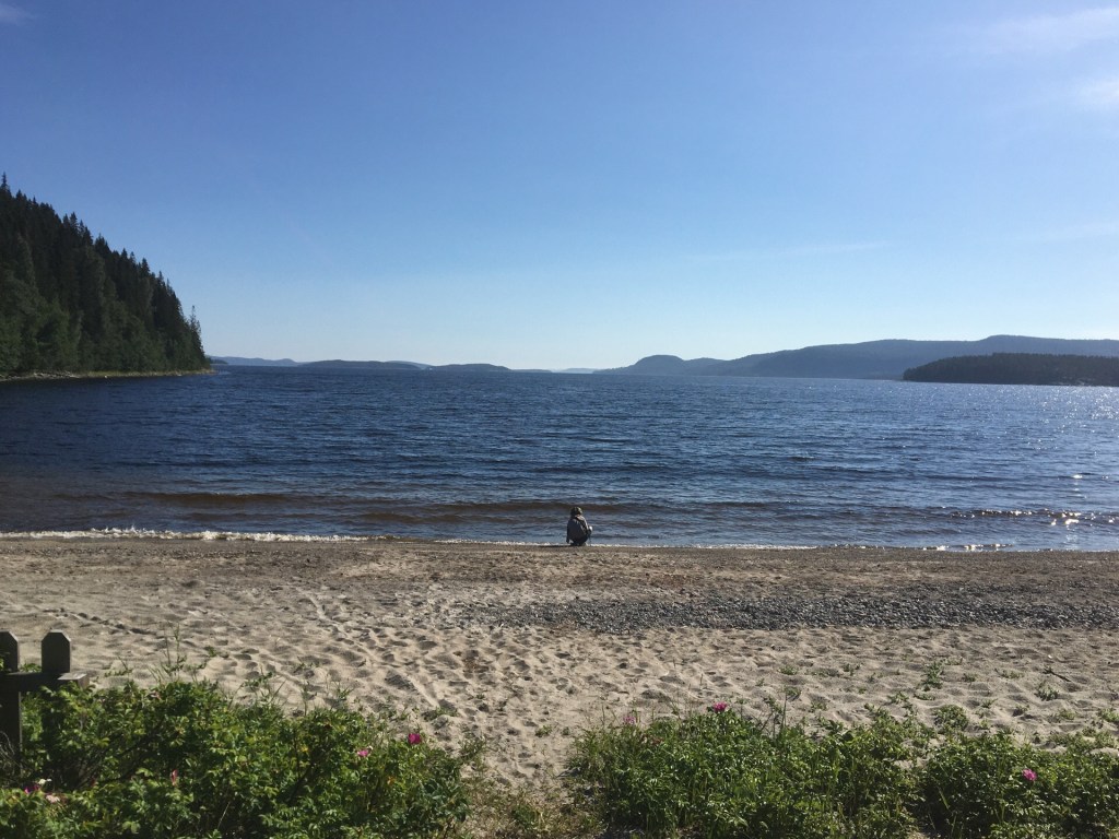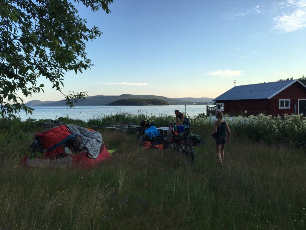Het gravelpad loopt langs de zee. De zee! Eindelijk. Zeelucht, golfjes, meeuwen, kleine strandjes… Het is een blij weerzien. Ons tentje mogen we opslaan op een klein veldje grenzend aan het strand omgeven door bloemen. Een buurman verontschuldigt zich dat hij het gras niet afgereden heeft. We were a bit lazy. Het water van de Botnische Golf is heerlijk. 22 graden en helemaal niet zo zout.