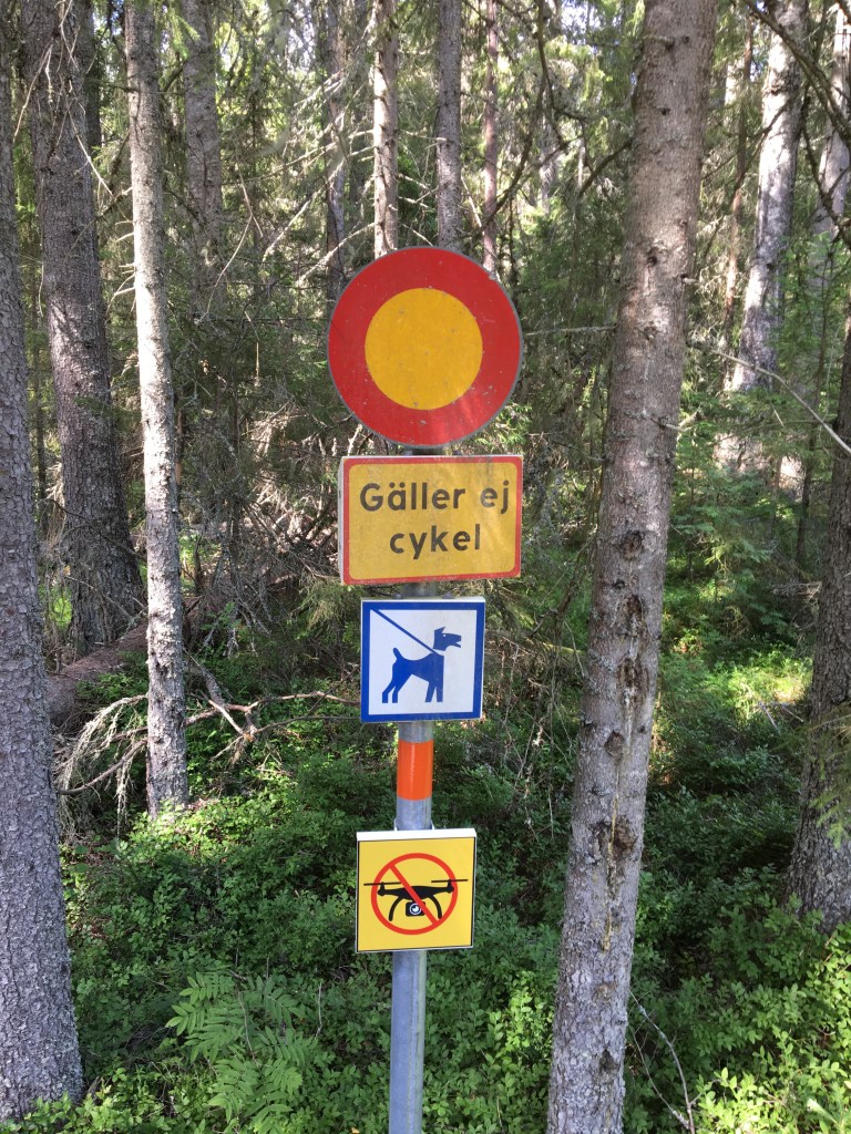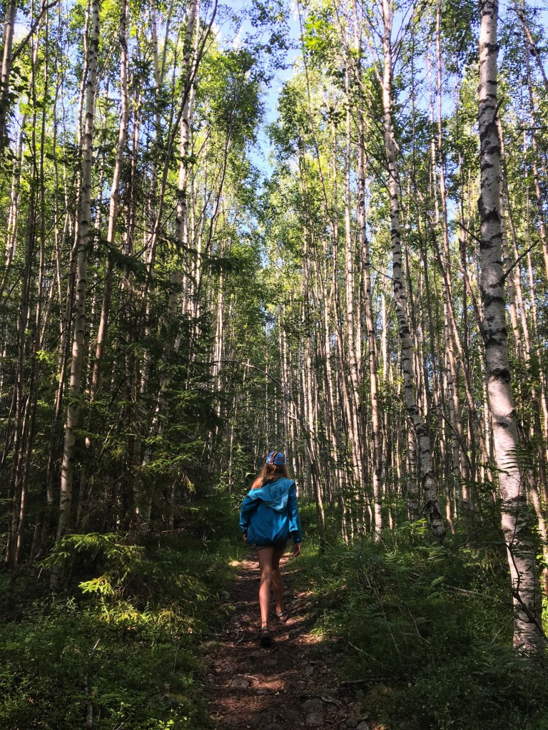We slapen heerlijk in de tuin van de bootclub. We zijn niet de enige wild kampeerders, er staan verschillende trekkerstentjes van Höga Kusten-leden stappers. Onze tent is wel de enige tent die in de schaduw staat. We zijn ondertussen expert in het zoeken van een goede tentspot. Waar is het Westen en waar is een boom? Daar komt de tent. Alle tentjes zijn al opgeruimd en de trekkers vertrokken als wij aan de ontbijttafel zitten. Op 2 km ligt de noordingang van Skuleskogen National Park, en daar gaan wij heen vandaag. We laten de tent staan, gooien alles binnen en rijden 2 km op een stijl gravelpad naar de ingang.