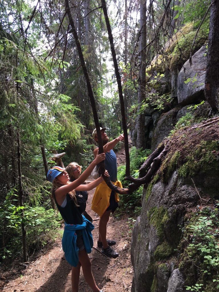 We lopen door de kloof en lunchen boven op de Slåttdalsberget, de berg die de kloof doormidden splijt. We eten brood en kaas en een taart met aardbeienconfituur van de supermarkt als dessert. De taart is mierzoet. De kinderen vinden het een hoogtepunt.