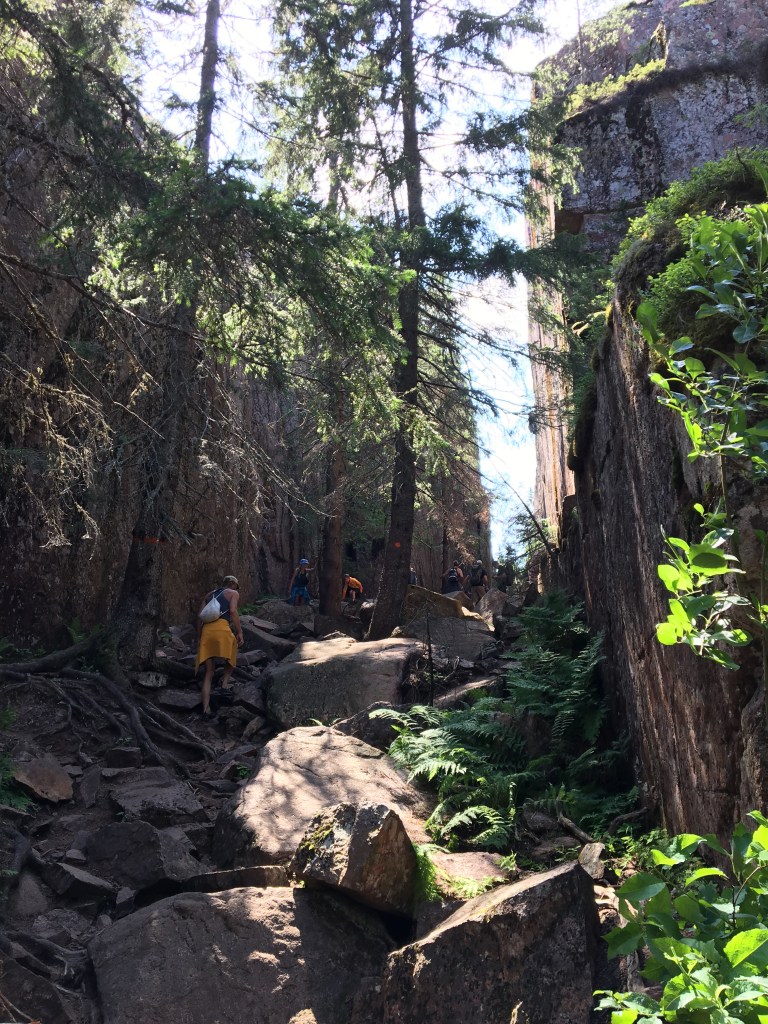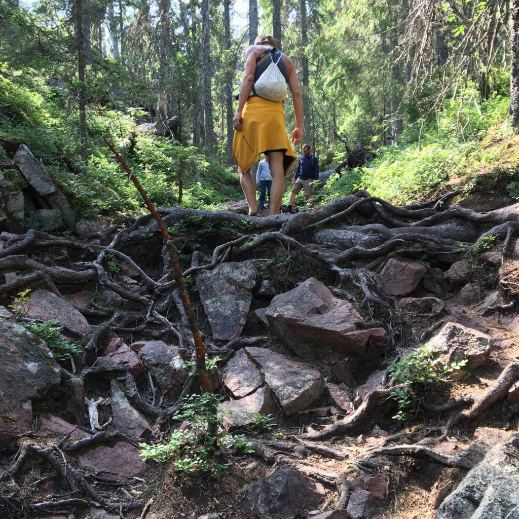 We wandelen naar de Slåttdalsskrevan door een woud dat tropisch aanvoelt. Intens groen met boomwortels zo hoog als rotsen. De Slåttdalsskrevan is een indrukwekkende kloof met aan weerskanten kaarsrechte rotswanden van 40 meter hoog. De kloof ligt op 162 meter hoogte en is 200 meter lang. Je kan er helemaal door wandelen.