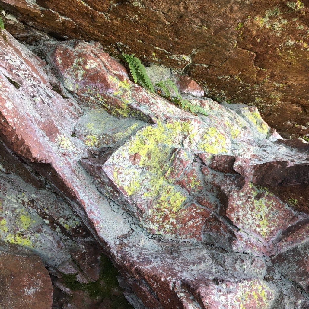 We keren terug langs een andere weg en passeren een diepe grot met felle schimmels.Via een lange grillige kloof dalen we af tot we op een pad langs de kust komen.