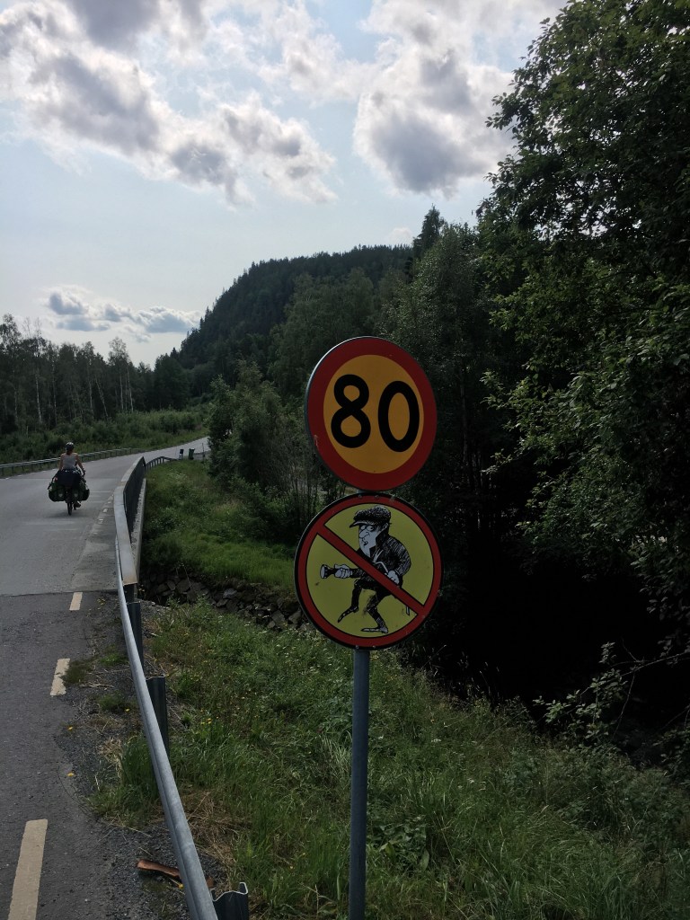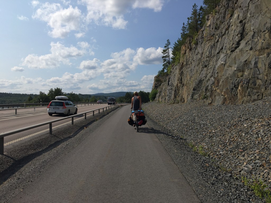 In Docksta houden we een lunchstop. We bakken eikes met spek langs de weg. Het is lekker. Daarna moeten we langs de E4. Er is geen andere optie. Maar wat een aangename verrassing. Er ligt een vers fietspad, het kronkelt soms een beetje naar boven maar het blijft de E4 volgen tot we eraf moeten.