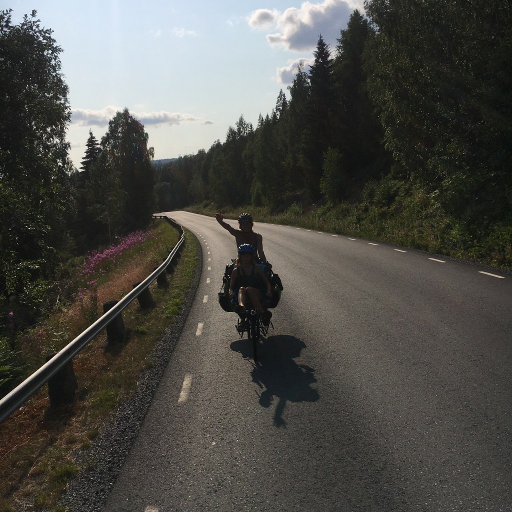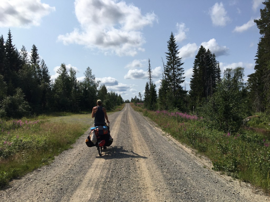 Ik weet niet hoe we het gedaan hebben maar zonder enig voornemen zitten we om 10:30 in het zadel. We hebben een stevige tocht voor de boeg, 75 km in een grillig landschap. We fietsen van Nåske naar Nörrfallsviken. Het eerste deel van de dag maken we een grote bocht rond de E4, de grootste en drukste autoweg in Zweden. Daar wil je niet zijn met de fiets. We rijden over stille gravelpaden, pittig bergop en bergaf, in de zon tussen kleurige bloemen.