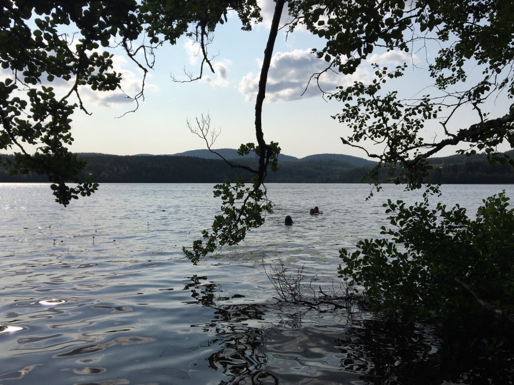 Na de E4 slaan we af naar het schiereiland waar Nörrfallsviken het eindpunt is. Er is veel verkeer, en het blijft stijl op en neer gaan. De Höga Kusten hebben geen hoge bergen maar de klimmetjes zijn wel hevig. Gelukkig komen we af en toe een meer tegen om even af te koelen.