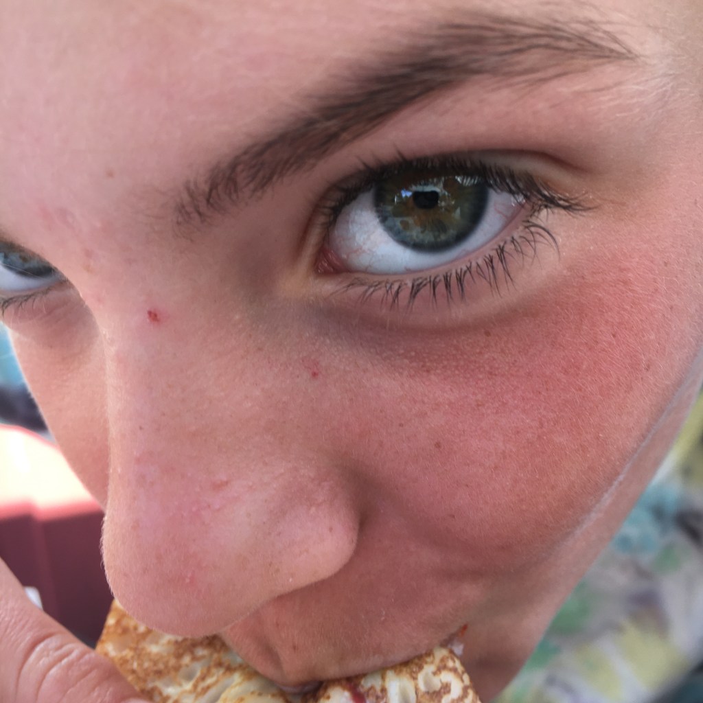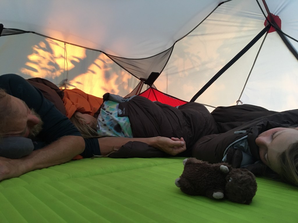 Het is geen fantastische nacht. De E4 raast de ganse nacht door onze tent en het terrein is zo hellend dat iedereen ‘s ochtends aan het voeteinde ligt.