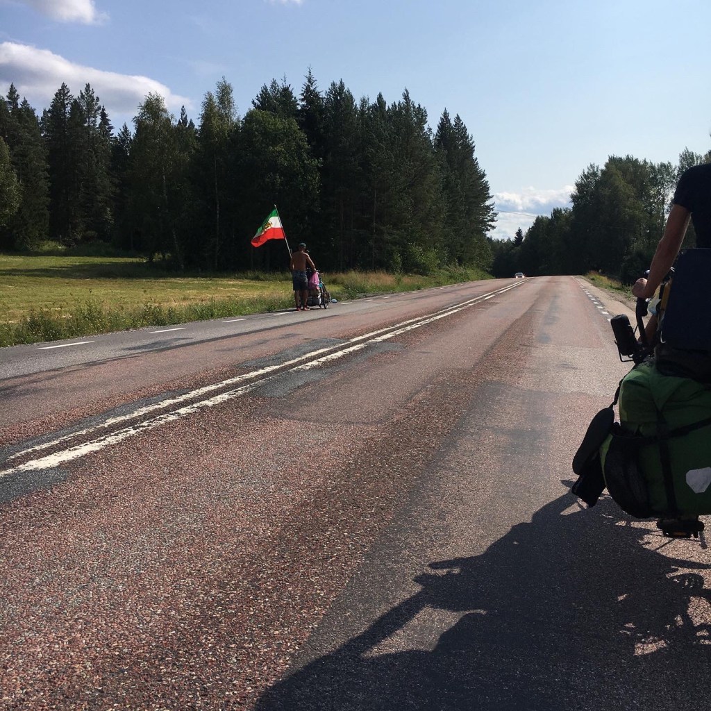 We volgen het grootste deel van de dag dezelfde hoofdweg. Het is warm en er waait een droge wind. Op ons pad doemt een man op die een fietskar voor zich uit duwt. Achter hem wappert een vlag die ik niet onmiddellijk kan thuis wijzen. Hij is Iraniër en wandelt voor de 3de keer van Zweden naar Iran uit protest tegen de Iraanse staat. Hij draagt de oude Iraanse vlag. Hij vloog al 2 keer in de gevangenis maar laat zich niet stoppen. Na deze ontmoeting zitten de kinderen vol vragen over de wereld.