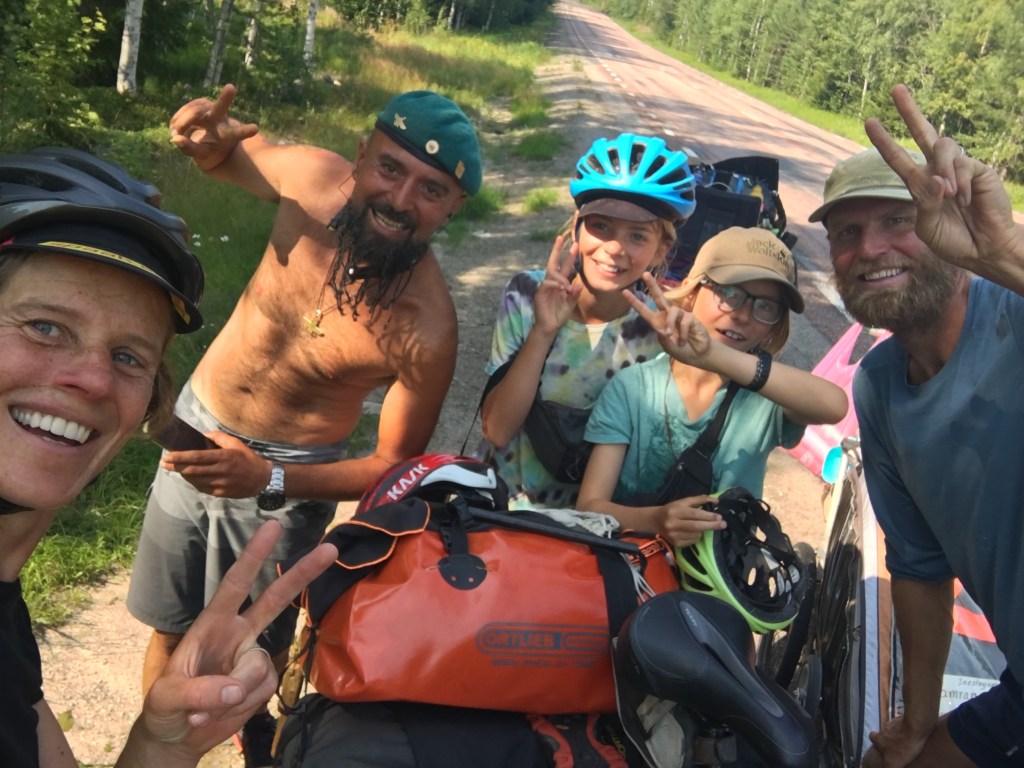 Op dezelfde weg, hetzelfde moment eigenlijk, zien we ook het Zwitsers gezin dat we gisteren ontmoetten. Ze hebben 3 maanden gefietst met hun kinderen en zijn nu met hun auto op de terugweg. Het is een leuk weerzien. We kletsen wat af de laatste dagen.