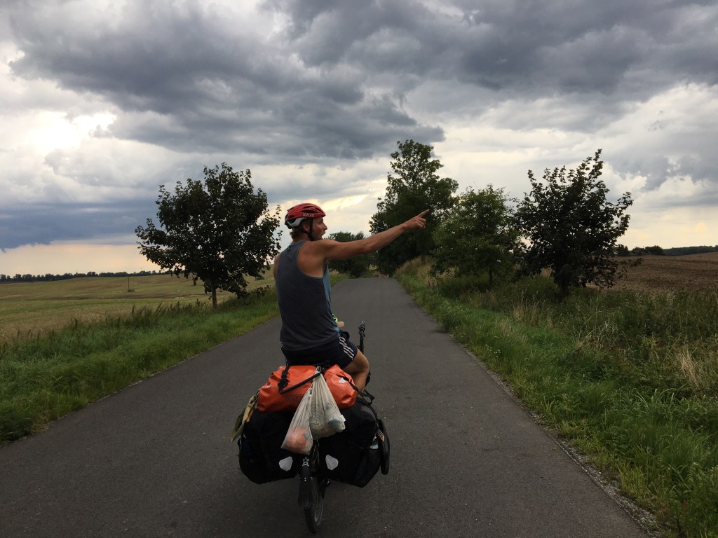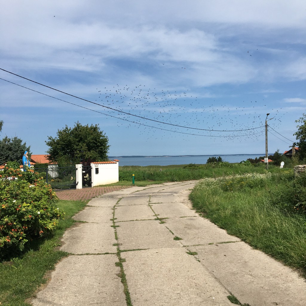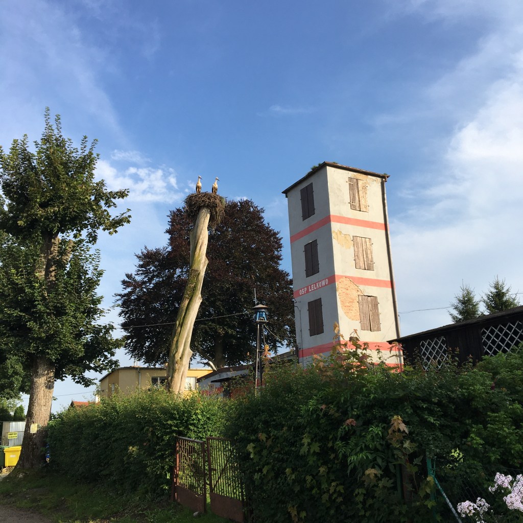 We rijden door smalle lanen met grote oude bomen, langs zanderige gravelpadjes, verweerde boerderijen, ooievaars bij de vleet, en ook een dreigend onweer dat losbarst als we in de Biedronka zitten. De Biedronka is de plaatselijke supermarkt.