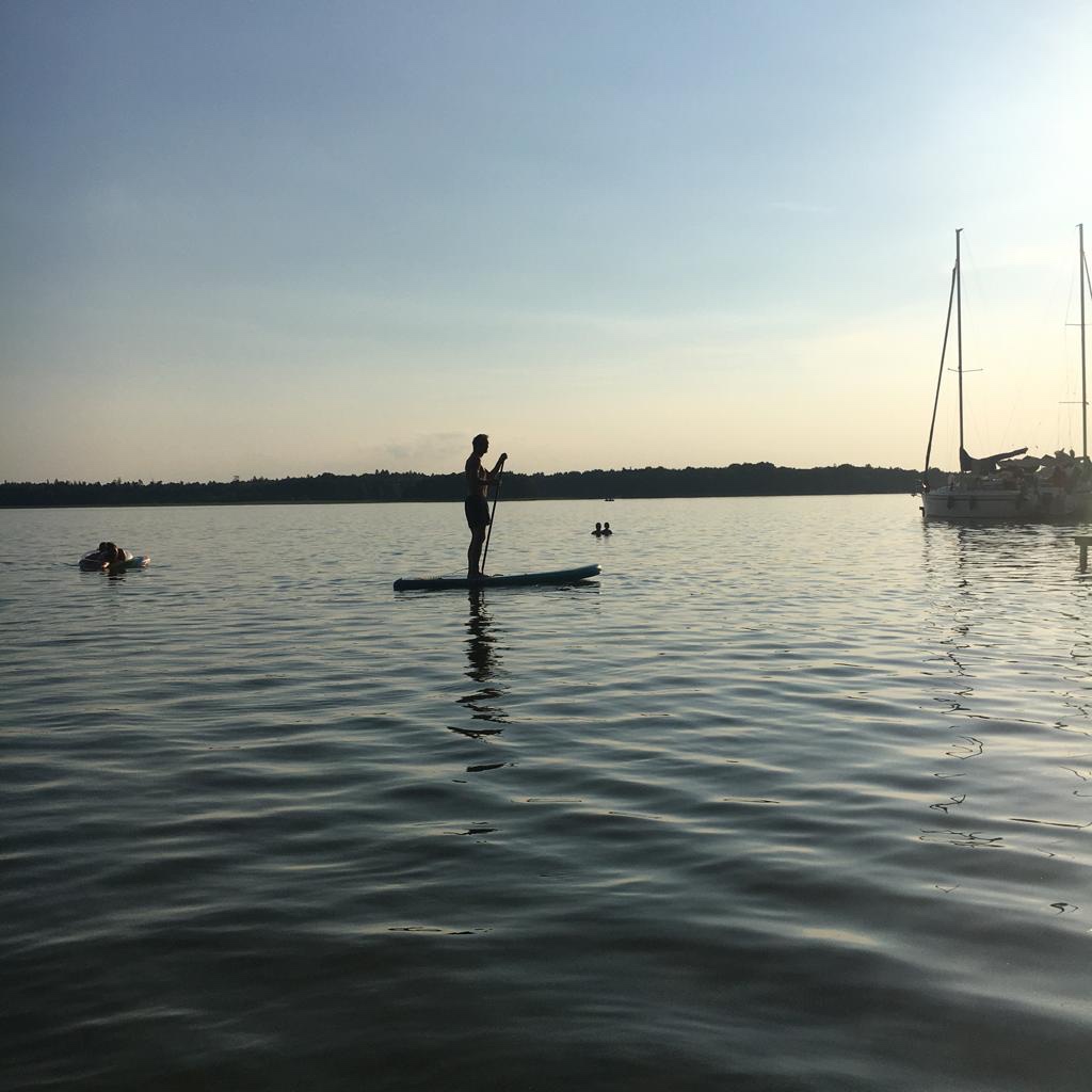 Uitslapen tot de zon op de tent de hersens doet smelten, wakker worden, langs de glibberige heuvel naar beneden glijden, naar het meer. Bart wast de fietsen in het water, die zitten vol zand na de zandwegjes van de laatste dagen. Het is een bijzonder plekje, een heuveltje met tenten en auto’s, een parking met auto’s, tenten en mobilhomes, een gezellige bar en een strandje in het gras onder de bomen. Het meer drijft vol zeilbootjes, eendjes en kleurige opblaasbanden. Het strand is een zootje van zeilers, kampeerders en dagjesmensen. Het is er kleurig en gezellig, met modderbabies, ijsjes en halve liters. Het is een dag van mensen kijken, lezen, wassen en van op een SUP de andere kant van het meer bewonderen.