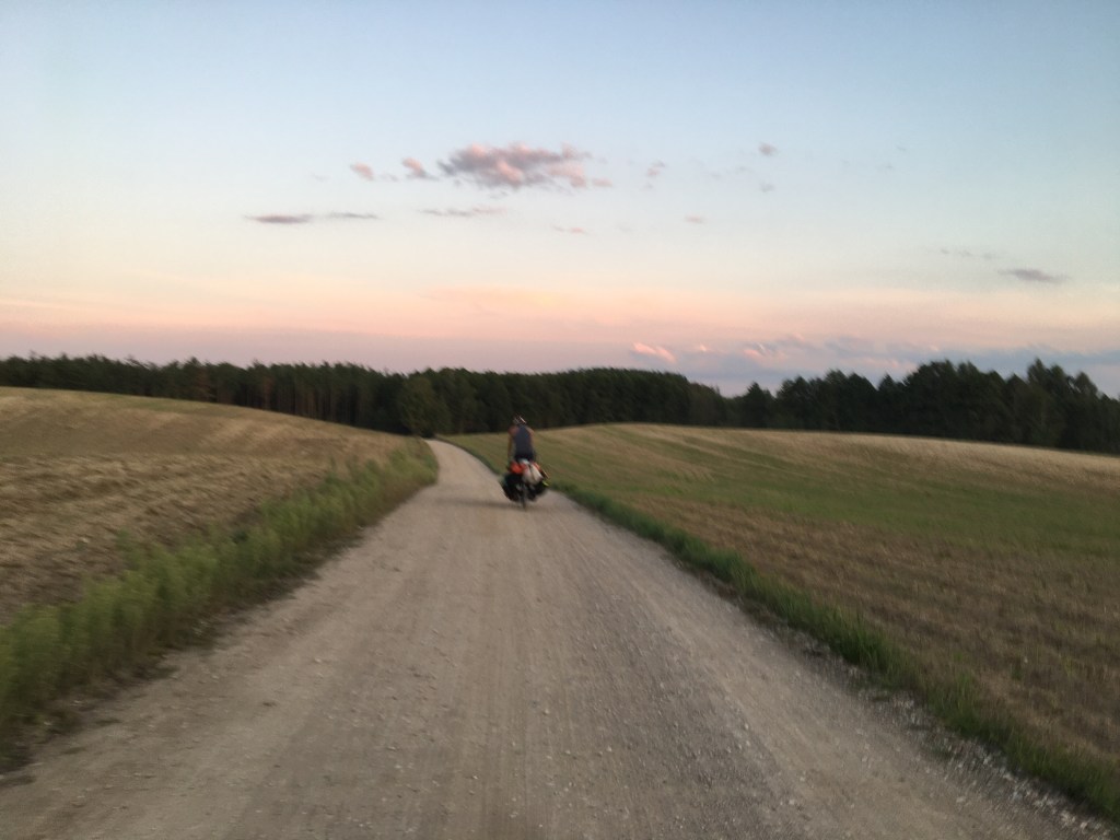 Onze eerste halte vandaag is het drielandenpunt met Rusland en Litouwen. We krijgen dat punt niet voor niets. Het landschap glooit, de gravel is zeer zanderig, het is zwoegen naar boven en glibberen naar beneden. Ik haat zand. Het drielandenpunt is 1 en al spierbalgerol.