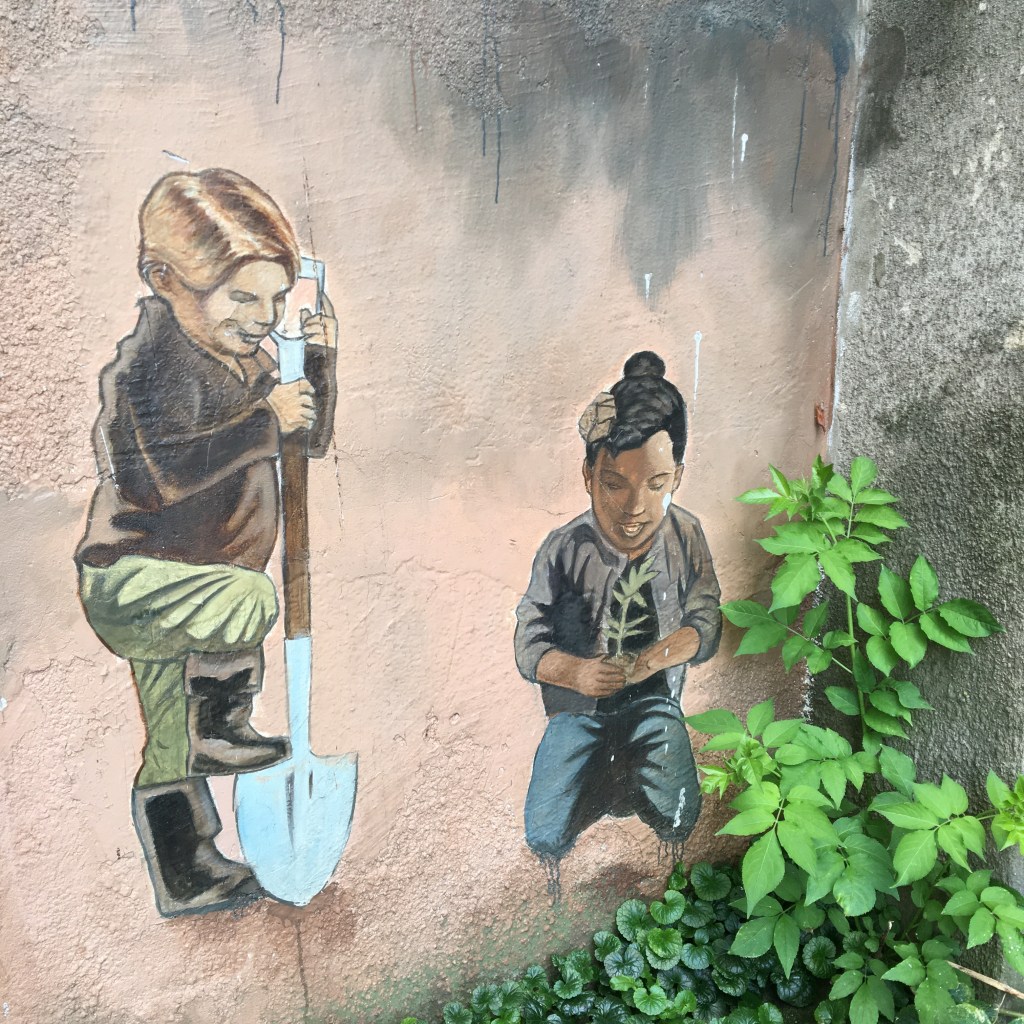 Het meisje dat een boom begiet, wat een mooi kunstwerk is dat !