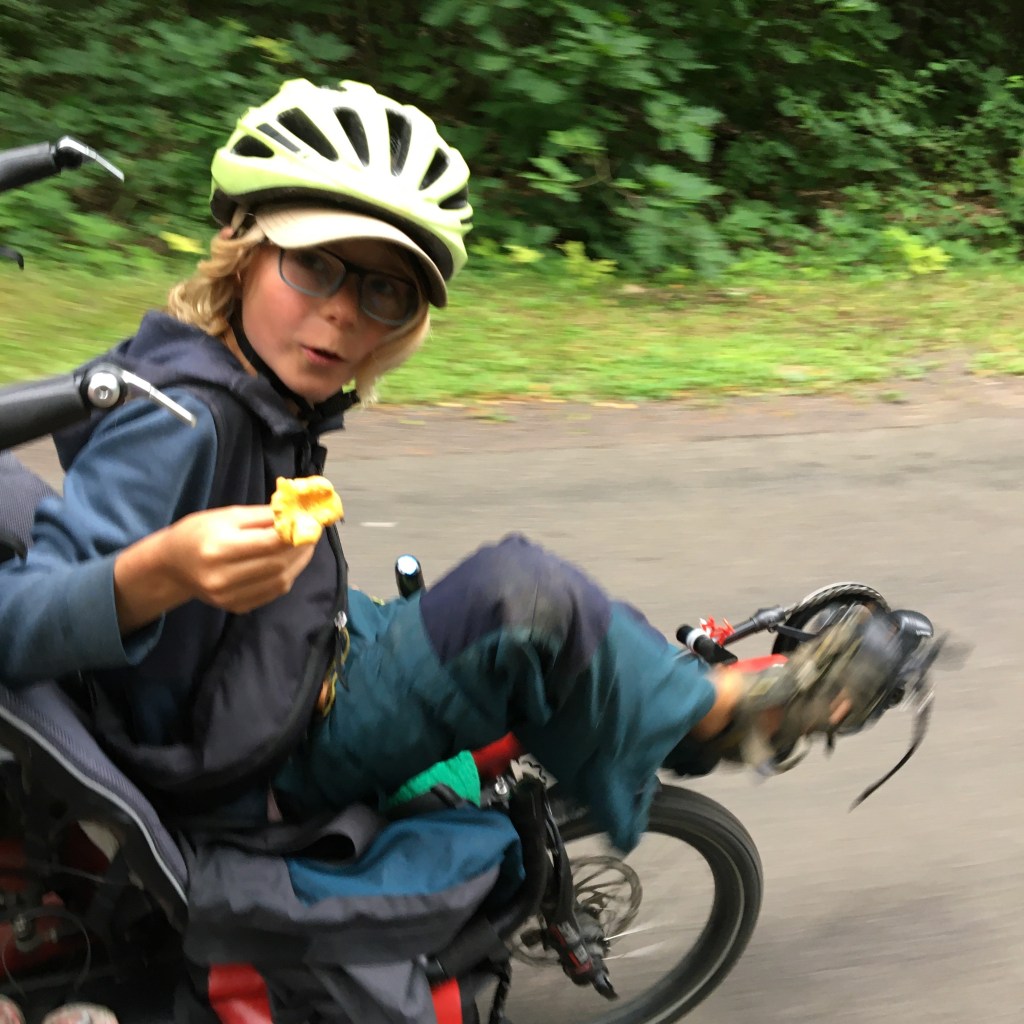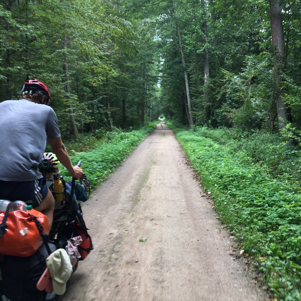 We rijden vlot de namiddag in. 20 km langs een mooi fietspad en daarna terug het bos in. Het is er heel rustig en heerlijk om te fietsen.