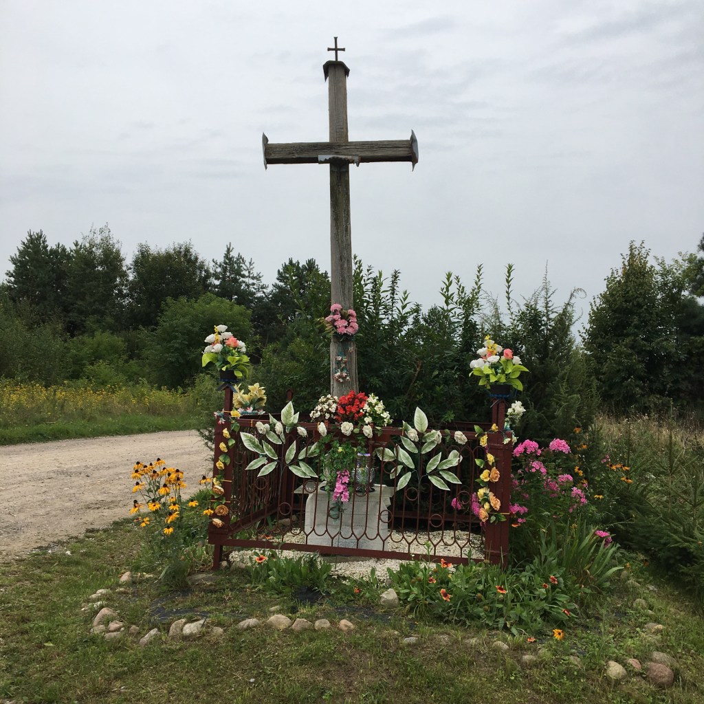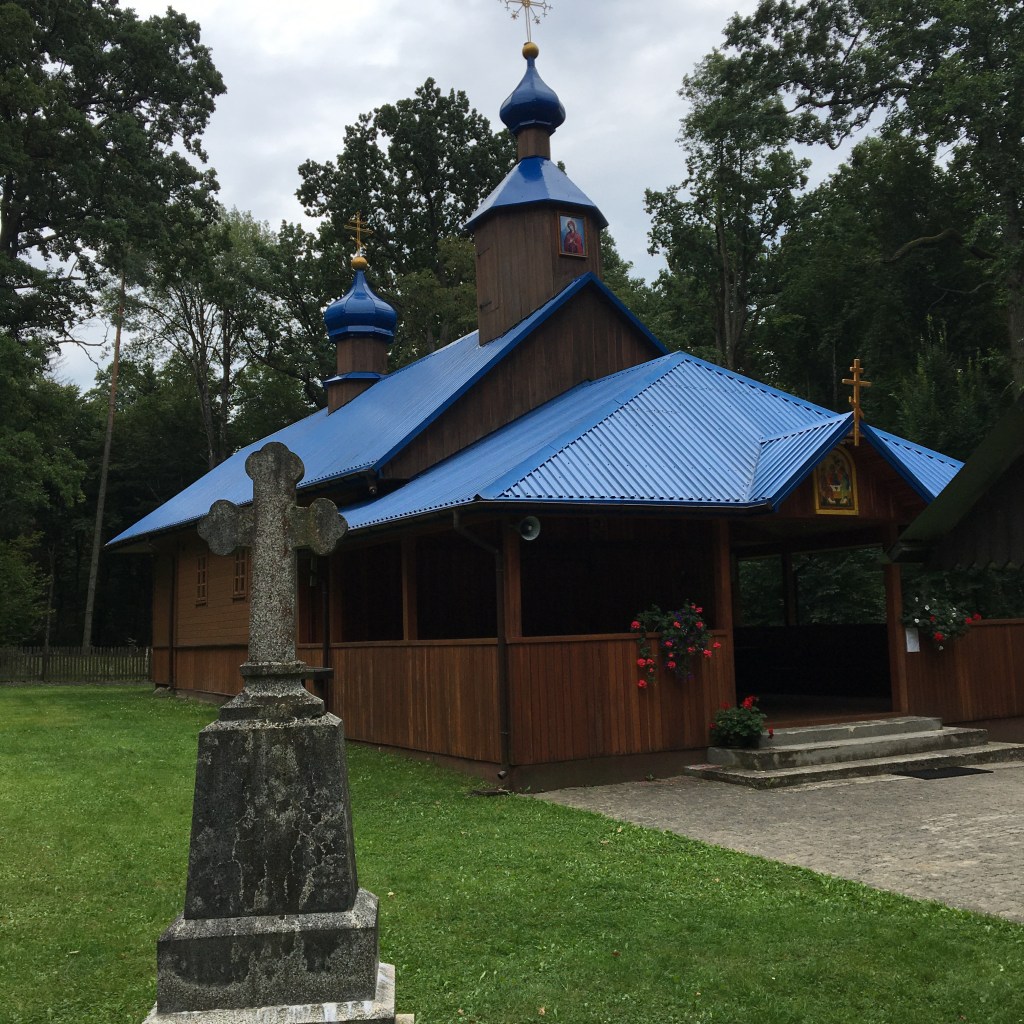 We rijden een mooie dag. Bos bos bos. Van de uiteindelijk 60km zijn er meer dan 40 die door het bos gaan. De eerste 20 gaan nog steeds door het woud van Białowieża. we rijden er fantastisch langs een mooi gravelpad en komen ook nog eens een orthodoxe kerk tegen. Helemaal in het woud, met blauwe koepels en reusachtige eiken errond.