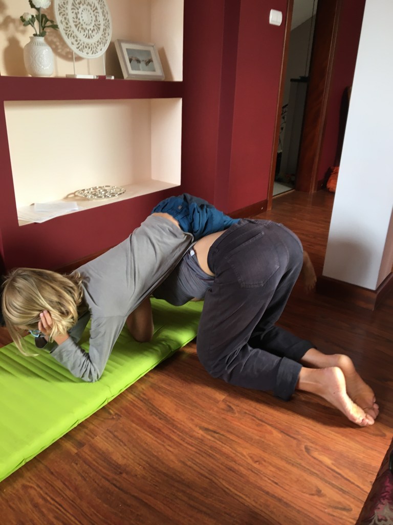 Er is ook 1 slaapmatje met een gaatje. Je valt ‘s avonds lekker zacht in slaap en ‘s nachts word je wakker op de koude grond. Ramon en ik doen eerst de luistertest maar zonder resultaat. Bart kruipt daarna in zijn onderbroek met het matje in het bijna lege Intex zwembad van Agnieszka en duwt het matje helemaal onder maar ook hij vindt het gaatje niet.
